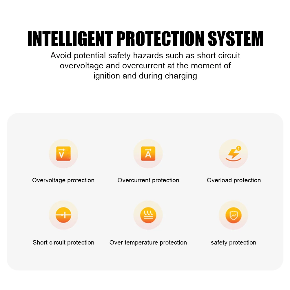 * 3. Мульти-защита от перегрева, перегрузки по току, перезарядки обеспечивает безопасное использование, автоматическое отключение, когда аккумулятор полностью заряжен.