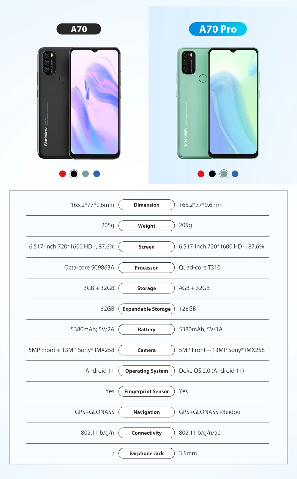 BLACKVIEW A70 Pro смартфон с 6,517 дюймовым дисплеем, четырехъядерным процессором 4 Гб ОЗУ + 32 Гб ПЗУ, 5380 мАч, 13 МП + 5 Мп камерой, 4G Android 11, мобильный телефон