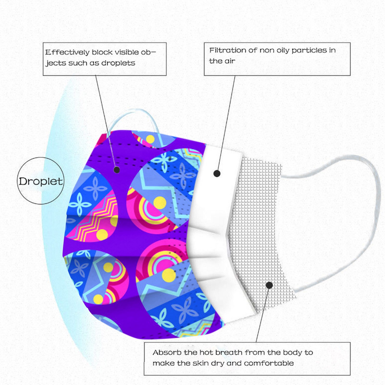 3 слояОдноразовая маска изготовлена из 3 слоев гидросплетенная ткань для тканевого материала,Безопасно для использования. Дышащий материал и милые узоры, что делает его полезным и модным. Специальный 3 слоя из нетканого материала, дизайн, обеспечивает некоторые меры защиты от автомобильный отходящий газ, пыльцу и т. Д. Эластичная петля уха позволяет легко снимать и надевать цепочку и не давит на уши. Маникюрный салон или любые другие области, где может потребоваться защита