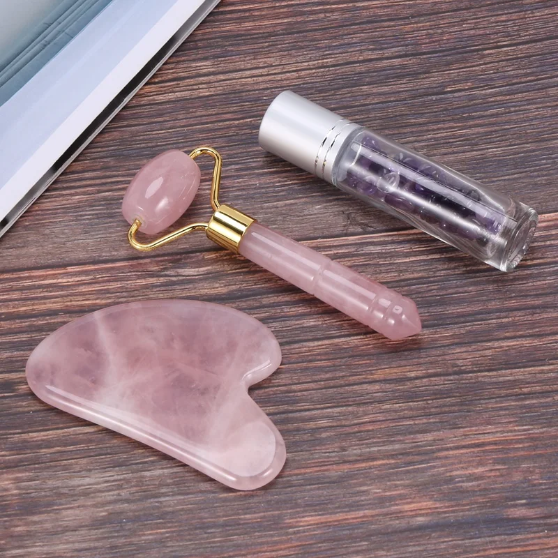Розовый кварц нефритовый ролик Gua Sha доска массажер инструмент лифтинга лица Guasha Массажная бутылка с драгоценными камнями комплект