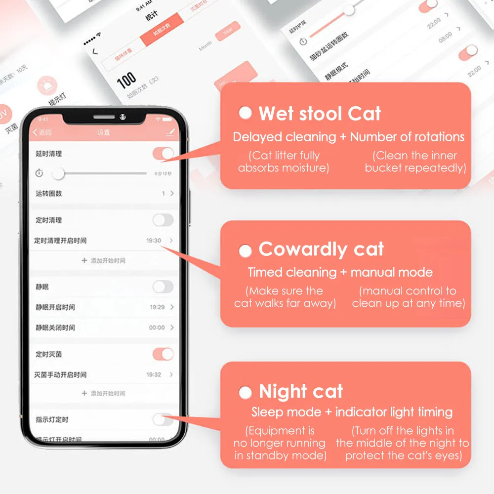 4x гравитационное распознавание, автоматическое распознавание кошек внутри и снаружи, задержка очистки в течение 3 секунд, предотвращение несчастных случаев и прав, интеллектуальная и Эффективная очистка и сбор кошачьего мусора в мусорном ведре ниже, вместо утомительной ежедневной уборки.