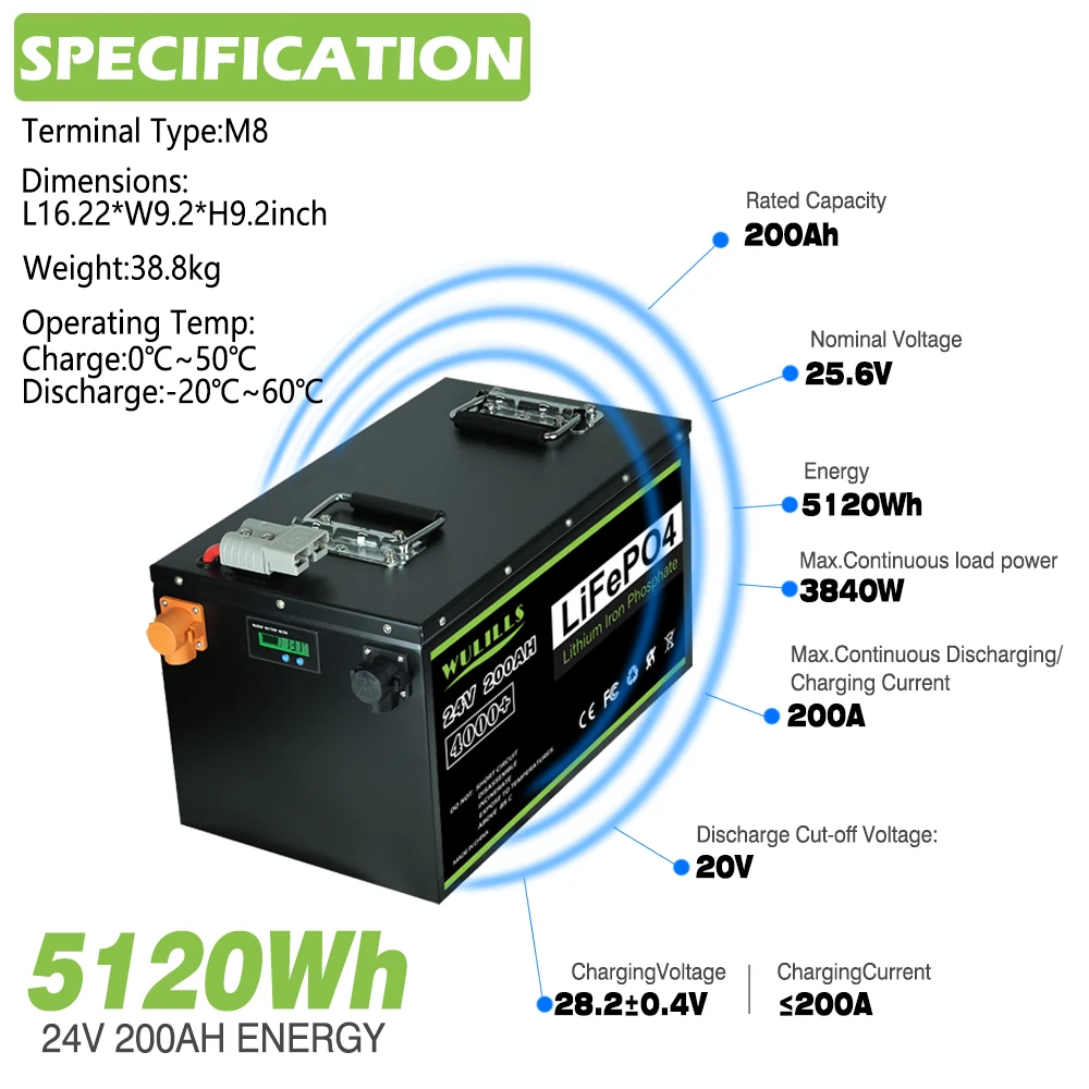 Номинальная мощность (0.2C): 200Ah / 5120Wh
