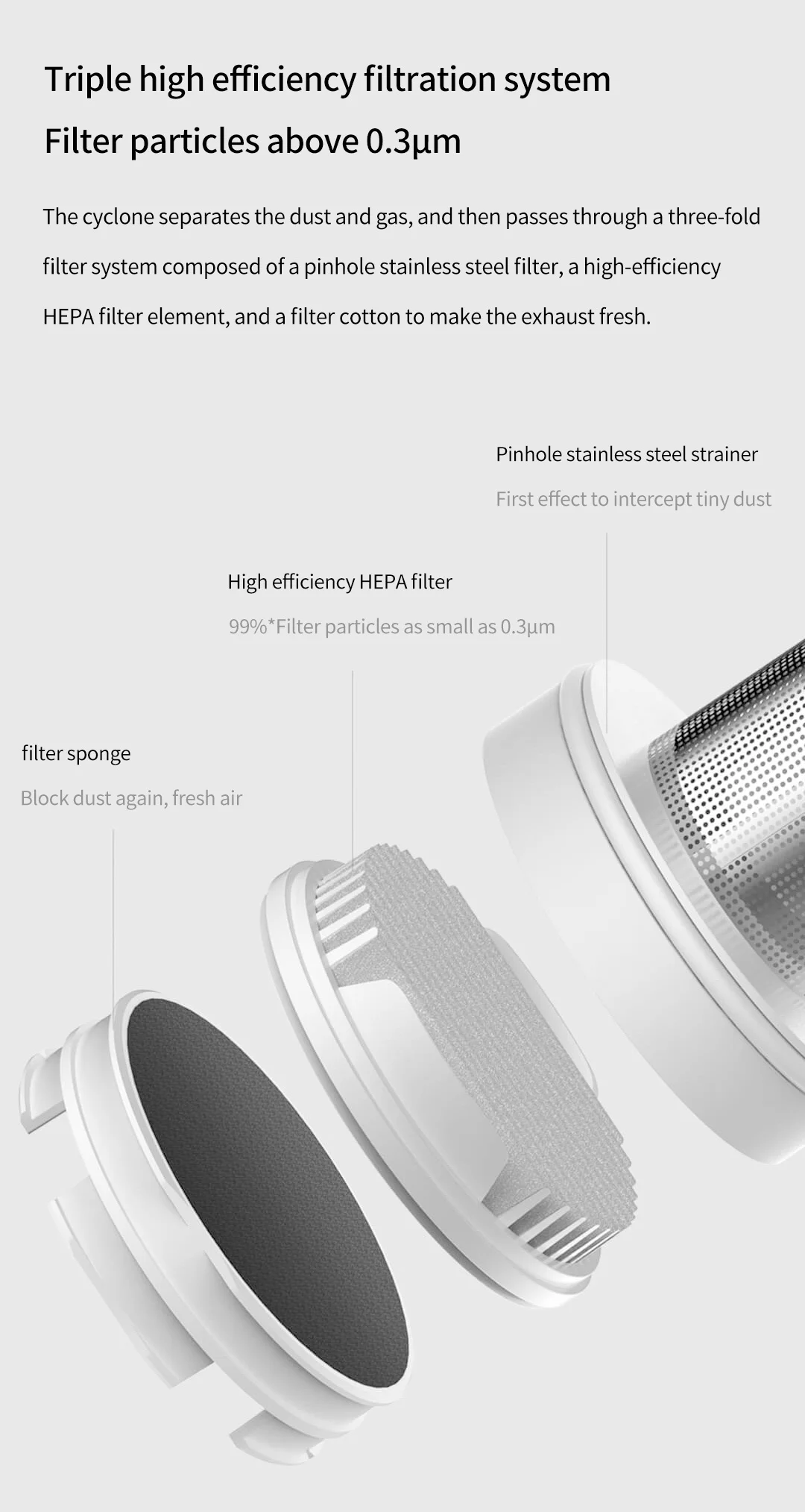 -Тройной высокоэффективная система фильтрации: циклон отделены от пыли и газа, а затем фильтруют частицы выше 0.3um с помощью 3-х кратного система фильтрации.
