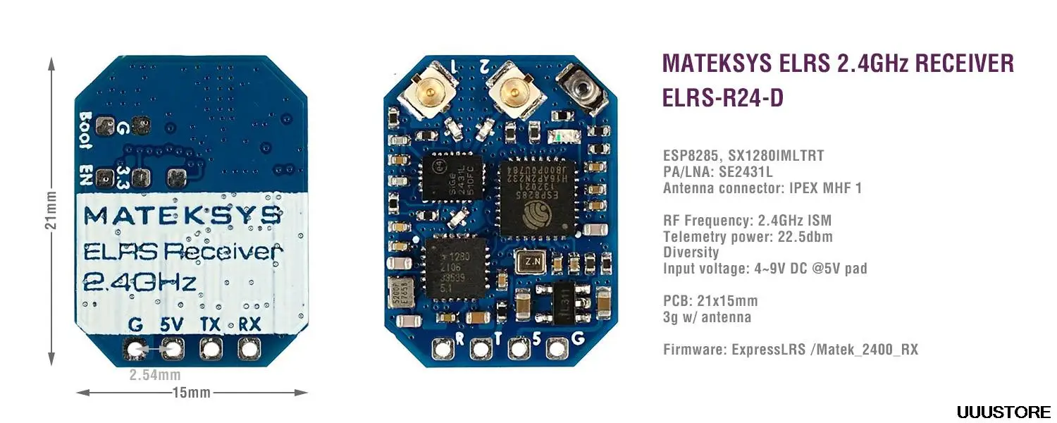 ESP8285, SX1280IMLTRTPA/LNA: SE2431LРазъем антенны: IPEX MHF 1Радиочастота: 2,4 ГГц (2400 ~ 2480 МГц)Мощность телеметрии: 22.5dbm ~ 23dbmSE2431L RX_gain: 12.5dBРазнообразие (переключение антенны), по умолчанию ANT2Протокол приемника: CRSFВходное напряжение: 4 ~ 9V DC @ 5V padРассеивание мощности: 40 ~ 45ма (перед связыванием), 70 ~ 75ма (переплет), 90 ~ 95ма (режим wifi)Размер печатной платы: 21 мм x 15 ммВес: 3g w/ 2x антенныУпаковка: 1 ELRS-R24-D, 2x антенны IPEX MHF1Firmwares