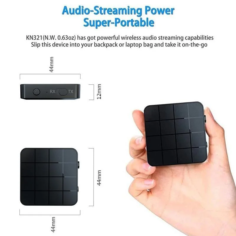 KN326 is only 44 mm (1.73 inches) and weighs only 18 grams (0.63 inches), but it has a powerful wireless audio streaming function. Put this transmitter and receiver in your backpack or laptop bag and take it with you without any effort.