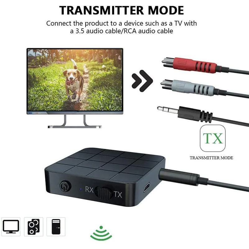 2. Transmitter mode: wirelessly transmit audio from a non-Bluetooth TV, home stereo system or CD player to a Bluetooth headset or speaker