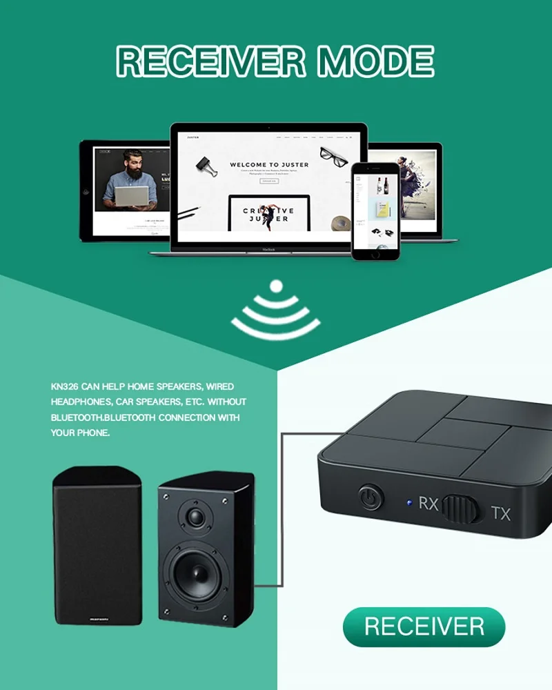3. Receiver mode: wirelessly transmit audio from Bluetooth-enabled mobile phones, tablets or computers to wired stereo, speakers or headphones