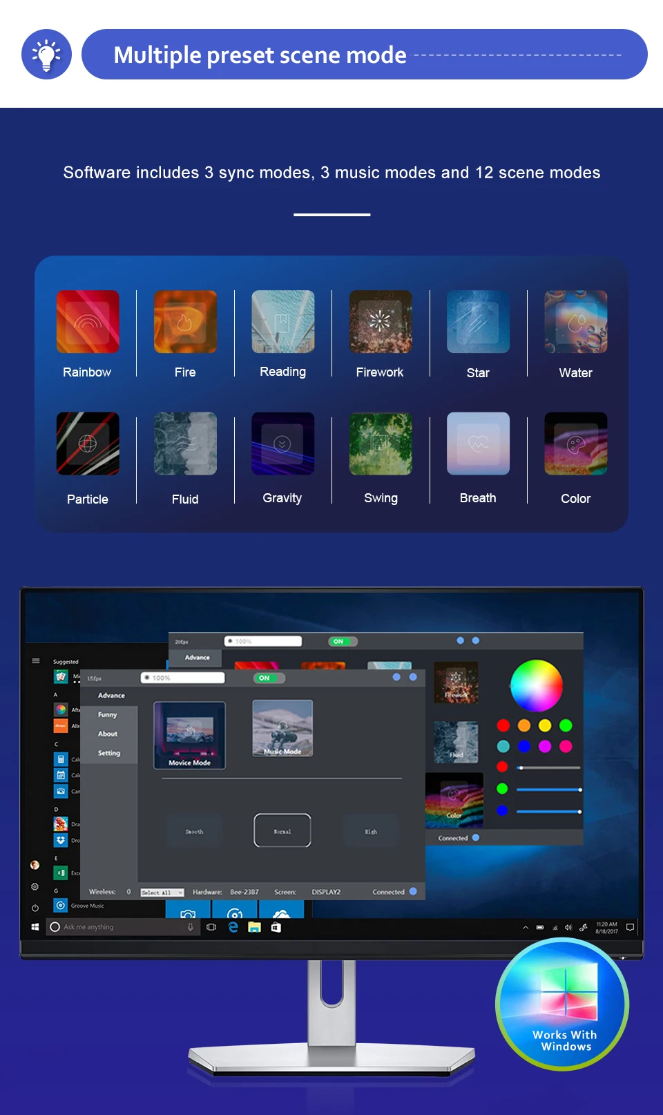 Декоративные огни-программное обеспечение включает Режимы синхронизации, музыкальные Режимы (спектр, электронные и лирицизмы) и 12 режимов сцены, таких как радуга, огонь, звезда, качели и т. Д.