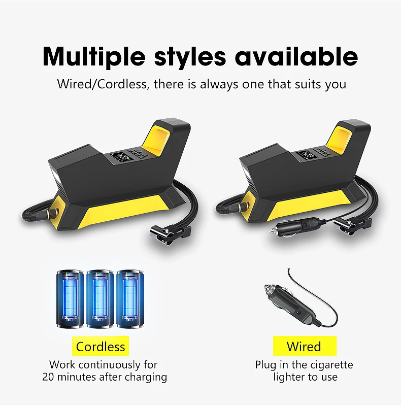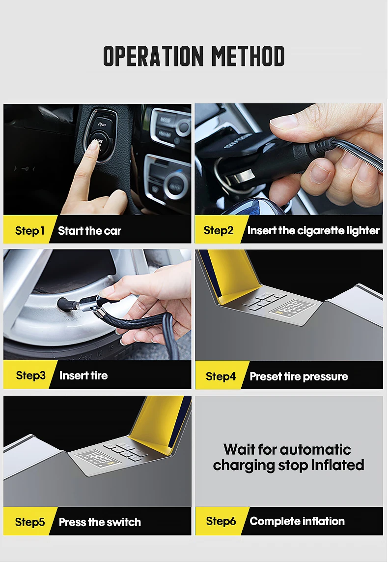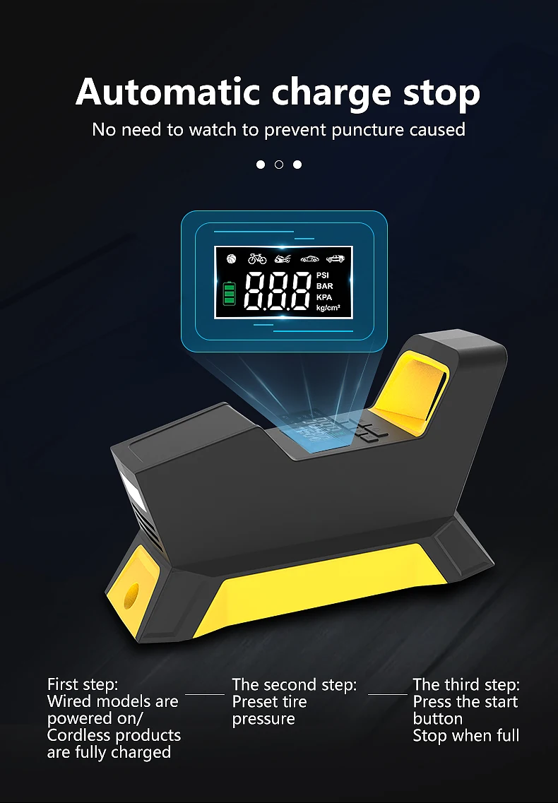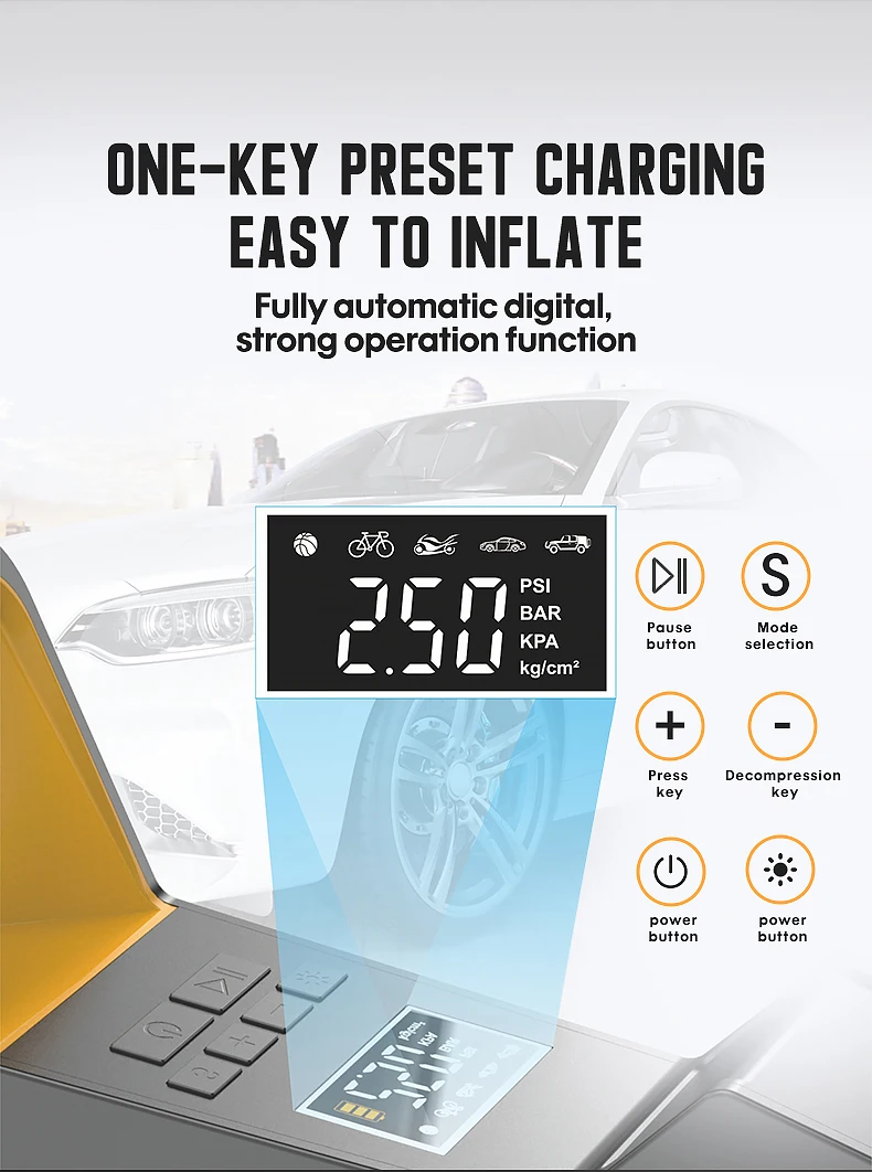 【Предустановленное и автоматическое отключение-Вы можете задать желаемое значение, и воздушный компрессор автоматически отключается, когда он достигает желаемого давления, поэтому вам больше не придется беспокоиться о чрезмерной надувании и недостаточном надувании шин.