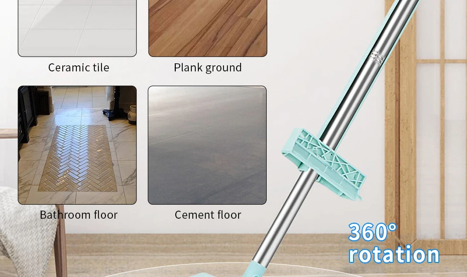 4.360°Rotation Makes Mopping More Flexible,This flat mop is designed with a versatile swivel head.Curved design is more suitable for the wall surface cleaning,With 360°rotation bar, easily remove crack dust.