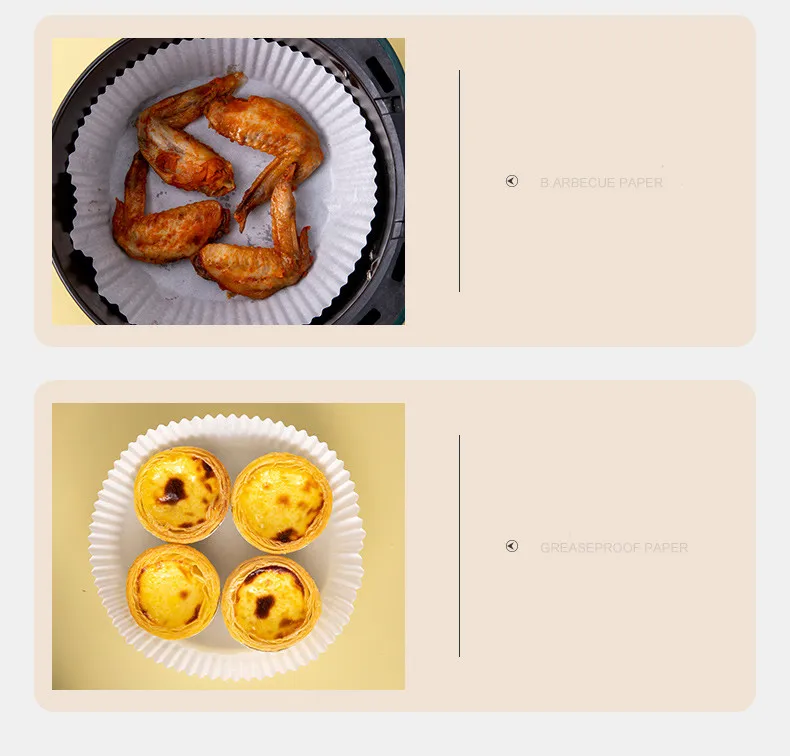 Термостойкость:Воздушно-жареная пергаментная бумага является водонепроницаемой, маслостойкой и термостойкой, до 450 °F (230 °C). Это может уменьшить использование масла или масла, и не скручивается или не горит в воздухе фритюрницы.