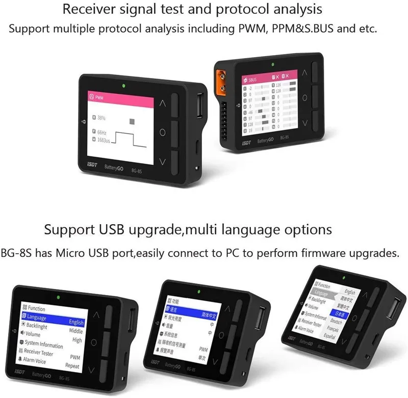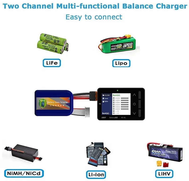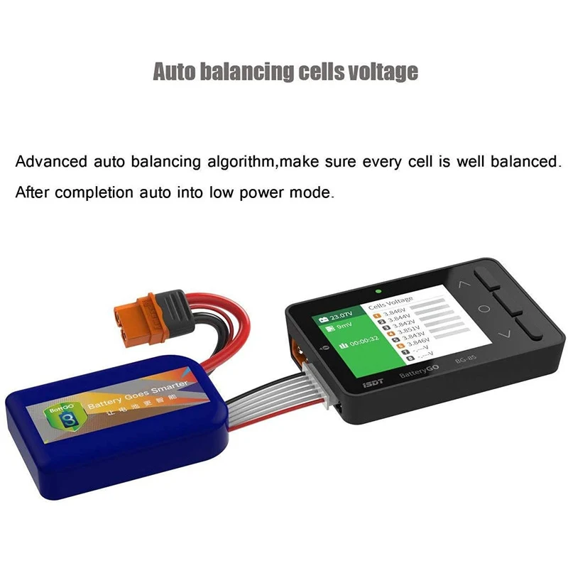 Умная Проверка батареи260000 цветной дисплей виден под сильным солнечным светом.Изысканная и мощная BG-8S smart battery checker полностью поддерживает технологию BattGO.Сделайте батарею умнееСотрудничая с технологией BattGO, только с подключенным XT60i, вы можете получить полное представление о параметрах деталей на вашем тесте. Легко считывать напряжение ячеек, циркуляцию батареи, рабочие параметры и быстрый набор к предпочтительным настройкам.Автоматическое балансирование напряжения ячеекУсовершенствованный Алгоритм автоматической балансировки, убедитесь, что каждая ячейка хорошо сбалансирована. После завершения авто в режим низкой мощности.Мощная портативная функция зарядкиПодключение к батарее, BG-8S может стать вашим внешним аккумулятором для мобильных устройств. Поддержка Qualcom QC 2,0/3,0, Совместимость с устройствами BC1.2 и Apple. Максимальная выходная мощность 12V/2A.