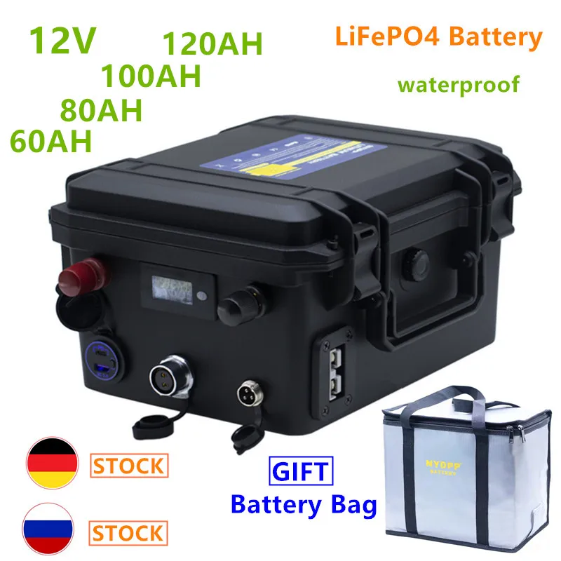 12V, 60AH, 80AH, 100AH, 120AH включает в себя 10A зарядное устройство и защитный чехол для аккумулятора.