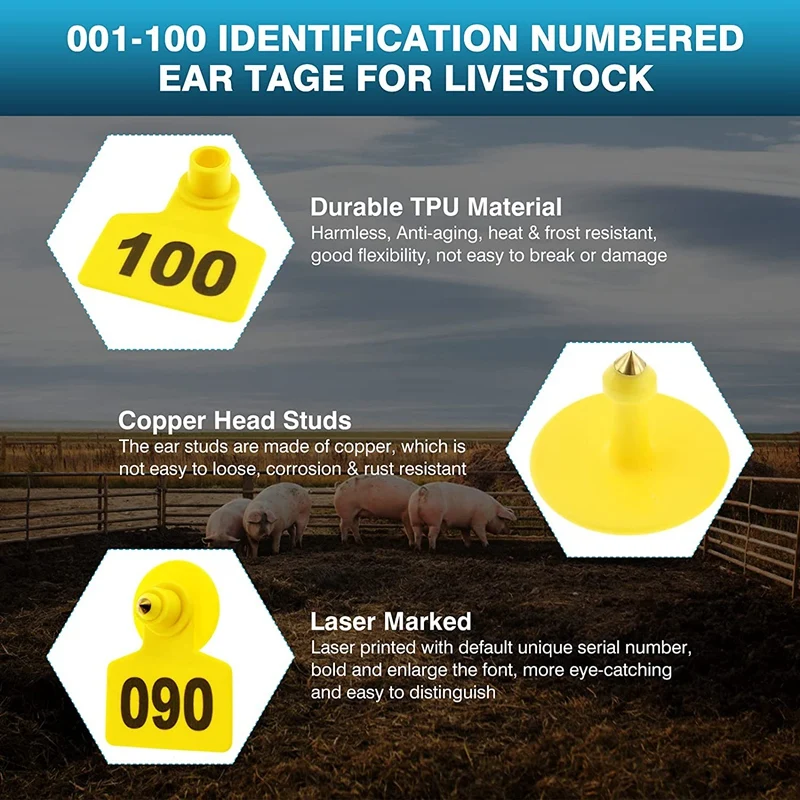 [Универсальные Ушные бирки для животных] этот идентификационный набор для ушей подходит для многих видов животных разных размеров, таких как коровы, овцы, козы, свиньи, олени, собаки и так далее. Маркировка является важной частью идентификации животных, которая позволяет животноводам, Селекционерам и ветеринарам удовлетворять их потребности в отслеживании и идентификации. Эти бирки используется для многих приложений, таких как сельское хозяйство, Лабораторные исследования и даже для владельцев домашних животных.