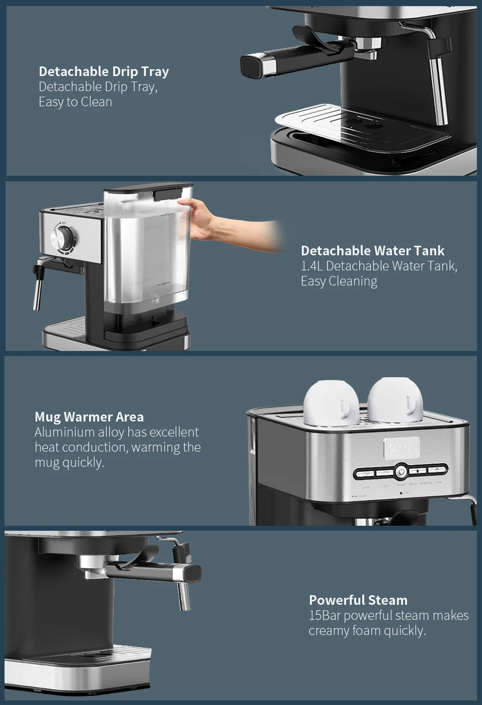 Съемный резервуар для воды и съемный поддон для капель, который собирает брызги, чтобы избежать возгорания, снимаются, что делает эспрессо-машину легкой чисткой.