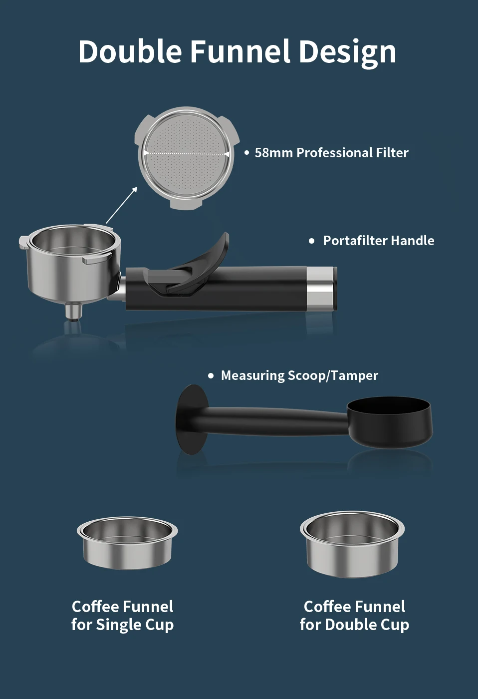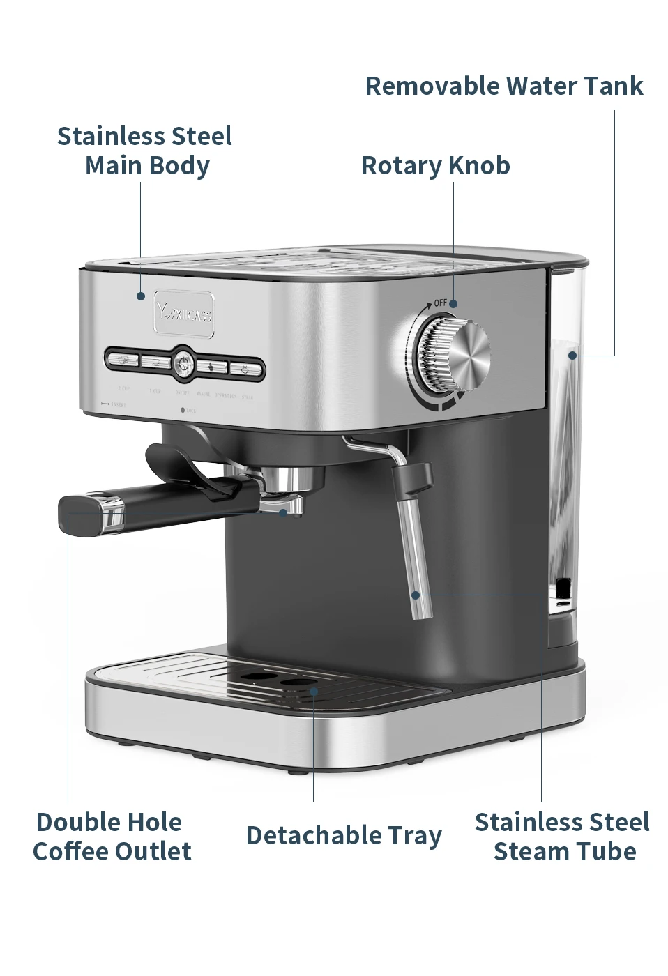 Основной корпус из нержавеющей стали, Поворотная ручка, съемный резервуар для воды, двойное отверстие для кофе, съемный лоток, Паровая трубка из нержавеющей стали