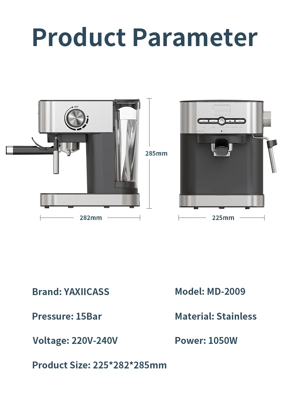 Бренд: YAXIICASS, модель: MD-2009, давление: 15 бар, мощность: 1050 Вт, напряжение: 220 В-240 В, размер изделия: 225*282*285 мм