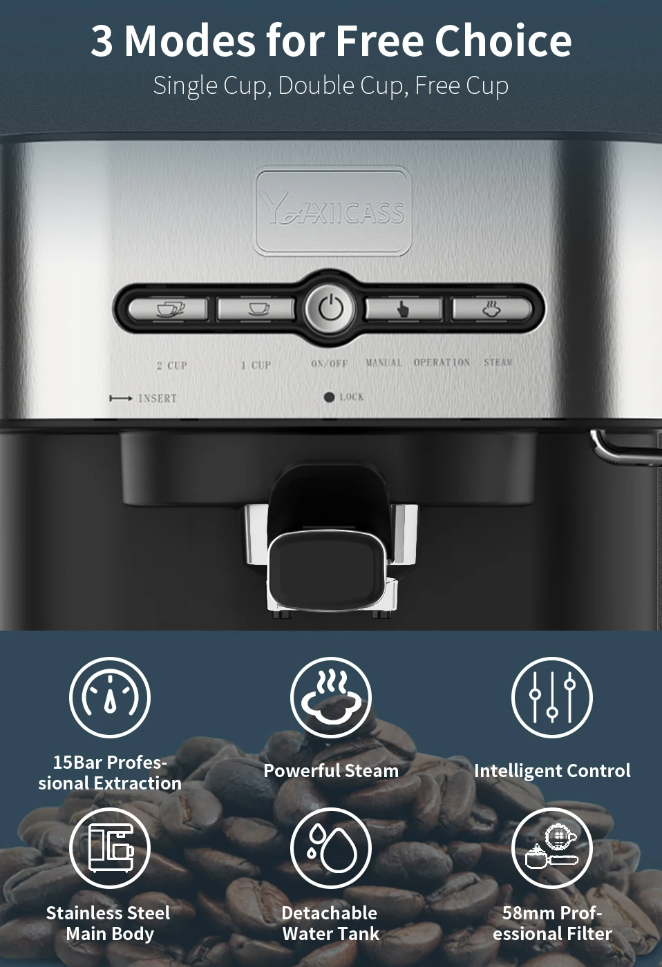 15Bar профессиональное извлечение, мощный пар, интеллектуальное управление, основной корпус из нержавеющей стали, съемный резервуар для воды, 58 мм Профессиональный фильтр