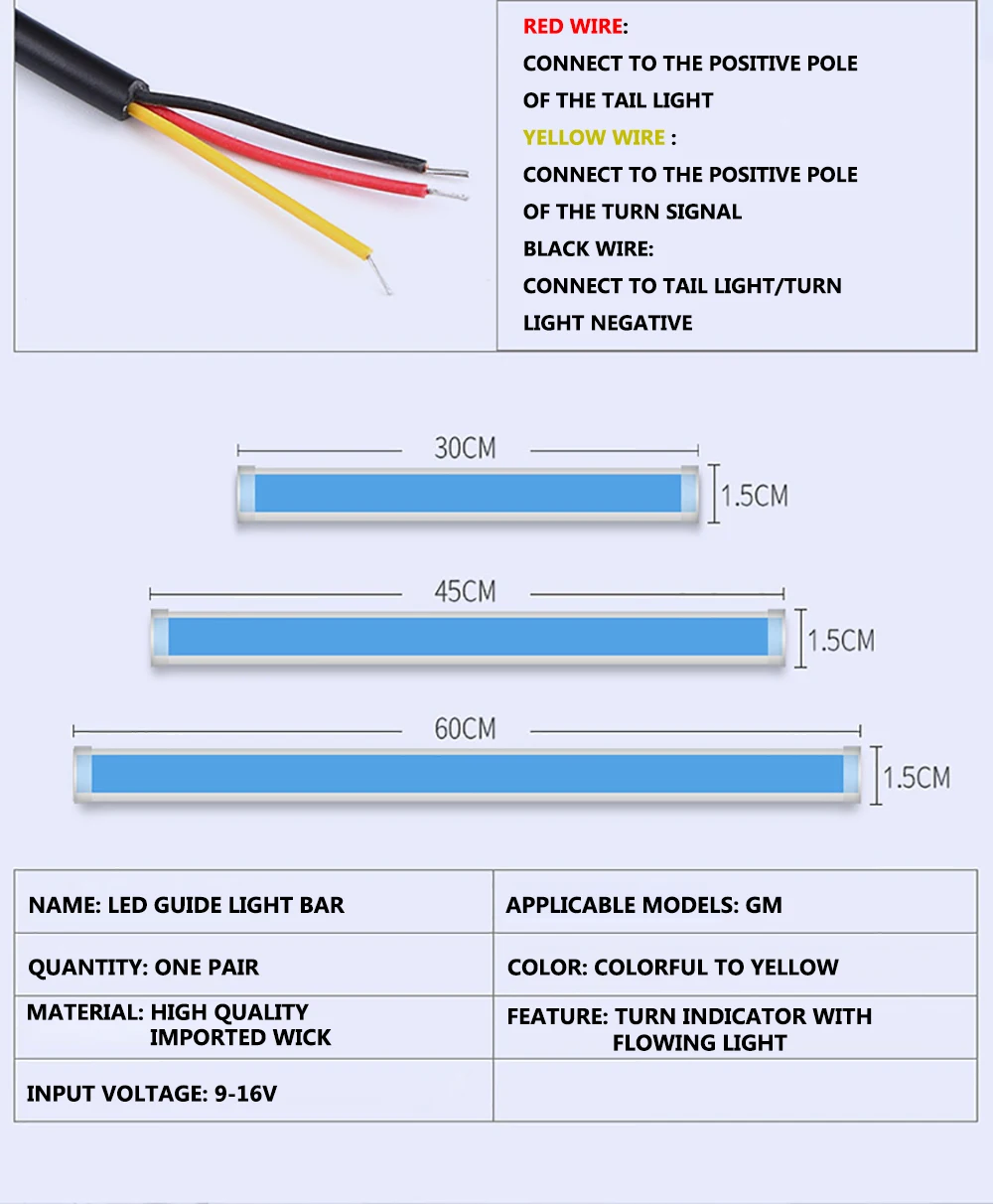 Красный провод соединен с положительным полюсом задний светильник, желтый и синий провод соединен с положительным полюсом сигнала поворота, И черный провод подключен к отрицательному полюсу задний светильник/Поворотная лампа.