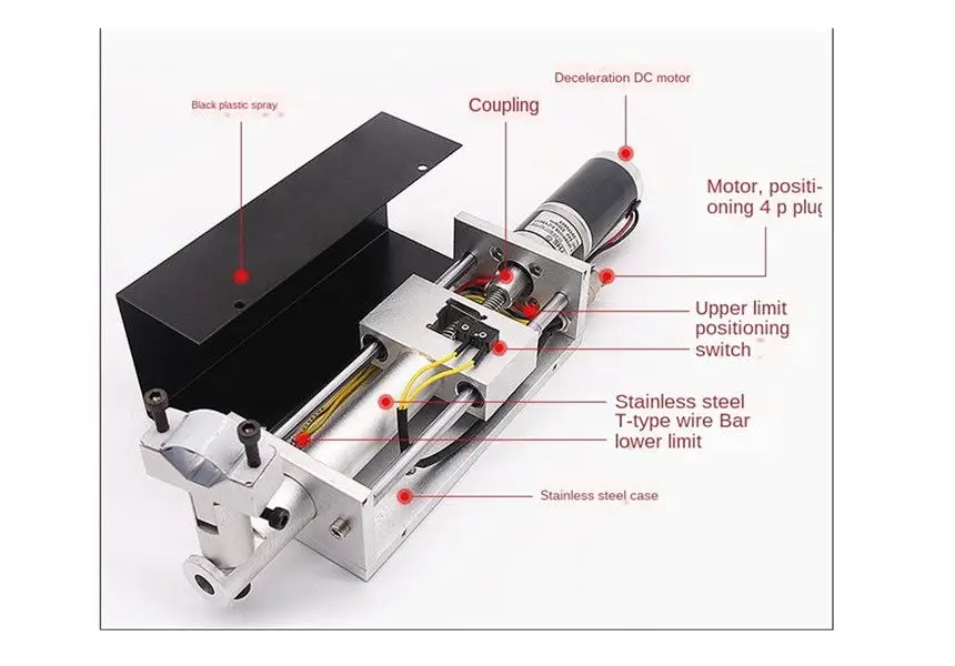 3. Механический механизм этого подъемника изготовлен из Тайваньского шарикового винта TBI, стандартного линейного вала (SFC) и линейного слайдера на концах; Фонарь-раскладушка/держатель изготовлен из подшипниковой стали, И крепится линейными ползунками, что обеспечивает стабильность и вертикальность движения подъемника