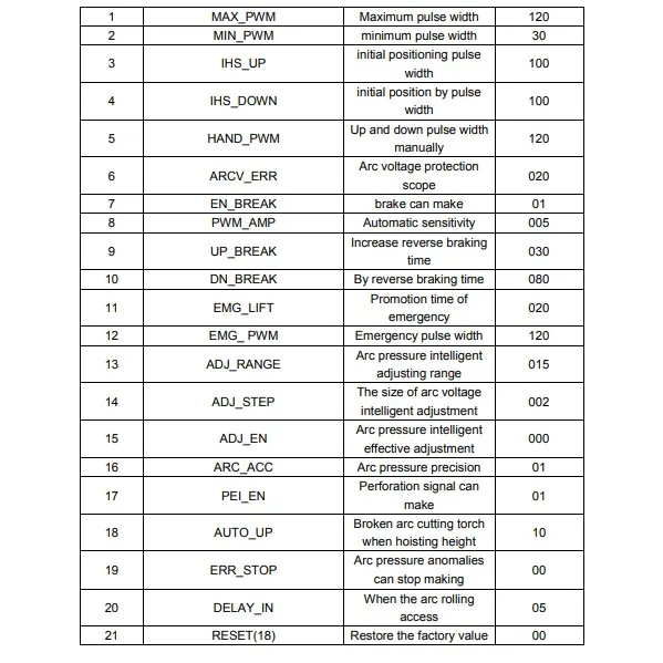 Задержка зажигания, задержка предварительного нагрева, задержка поднятия/понижения пистолета, задержка резака пистолета/нижний пистолет, задержка пистолета и т. д.;