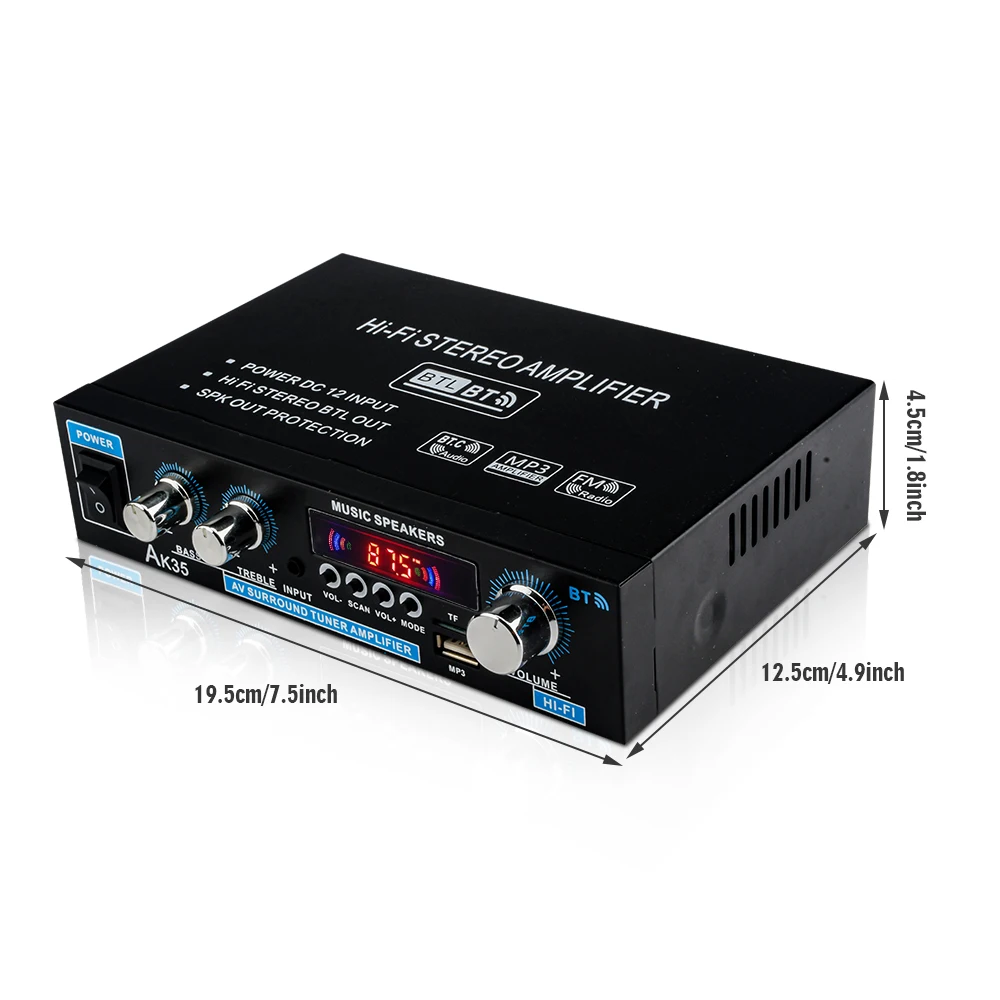 2. Цифровой усилитель мощности AK35 поддерживает различные внешние источники сигнала, поддерживает воспроизведение формата USB TF RCA AUX, поддерживает беспроводное соединение Bluetooth, поддерживает fm-стерео радио и два основных выходных канала.