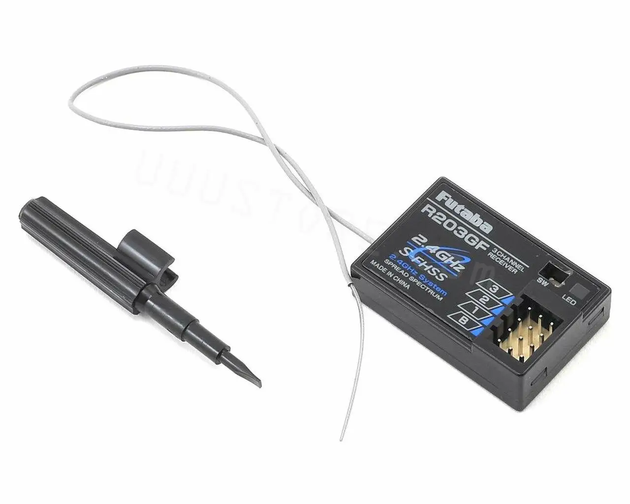 Система FHSS/S-FHSS/T-FHSS *Тип колеса3 + 1 канала (4-й канал используется только для смешивания функций)Частота передачи: 2,4 ГГцМощность требования: Размеры AA сухая батарея x 4 (6V) (или 5-сотовый никель-металл-гидридного/2-cell LiFe)Ток Слива: 100 мА или меньшеАнтенна передачи: 1/2λ di-pole (встроенный)Приемник R203GF: