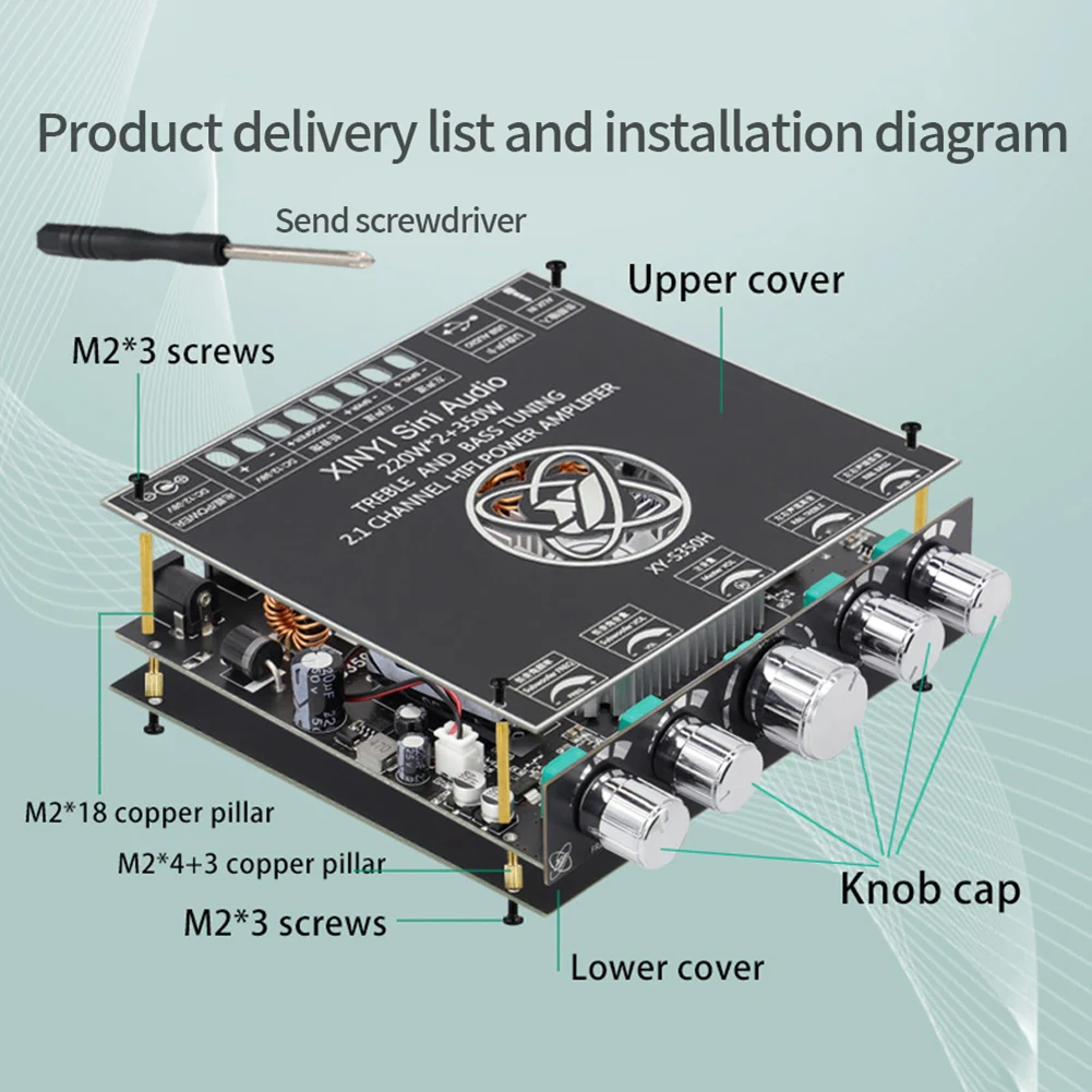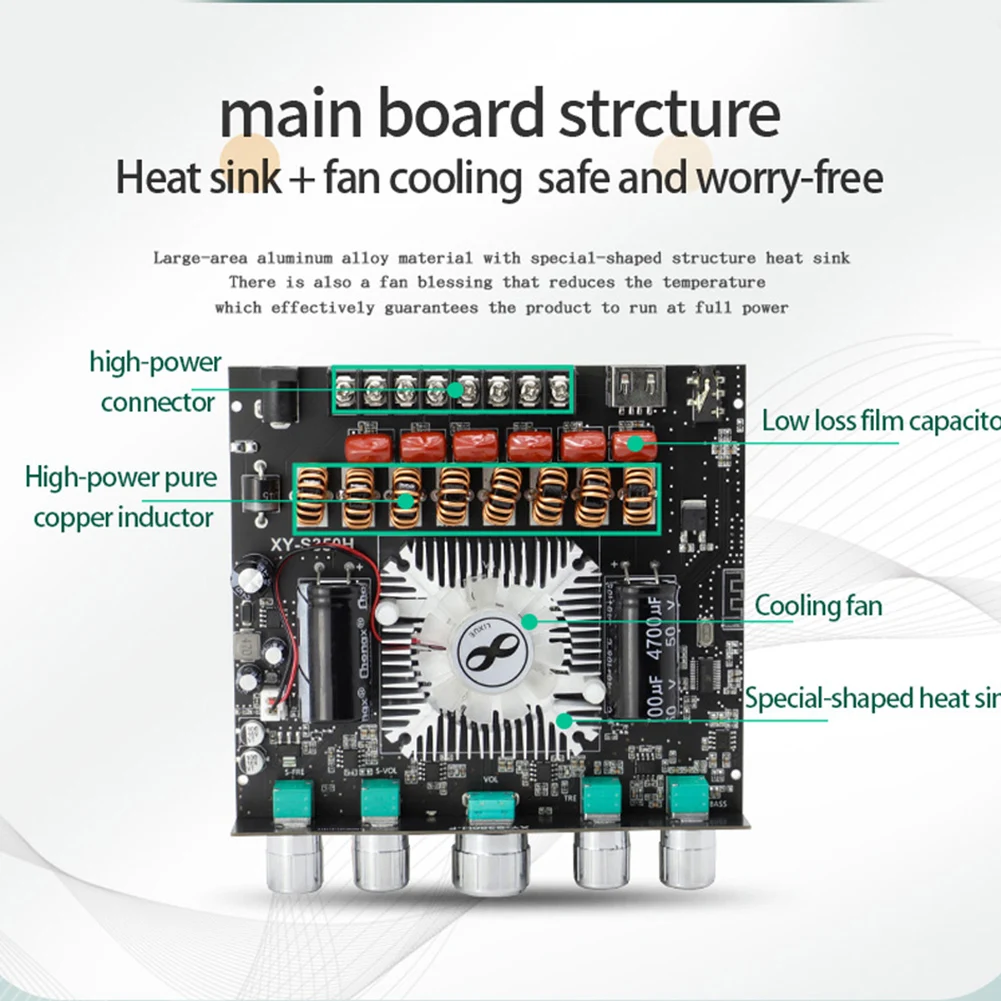 2. Bluetooth-совместимый 5.1 модуль усилителя мощности звука: 2,1 двухканальный стерео выход, выходная мощность 220 Вт * 2 (левый и правый каналы) + 350 Вт (сабвуфер), чистое HiFi Качество звука. Высокие частоты чистые и прозрачные, средние частоты нежные и деликатные, а басы резкие и шокирующие.