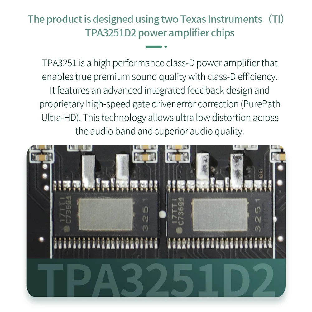 1. Оригинальная импортная схема чипа усилителя мощности TPA3251D2: TPA3251D2 является высокопроизводительным усилителем мощности класса D, который имеет эффективность класса D и может принести Настоящее высококачественное качество звука. Устройство имеет расширенные интегрированные Отзывы и собственную высокоскоростную коррекцию ошибок драйвера ворот (pure path TM HD). Эта технология позволяет устройству поддерживать Ультра-низкие искажения во всем диапазоне частот аудио и одновременно показывать высокое качество звука.