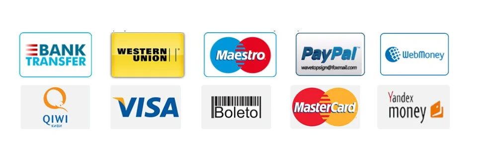 Мы принимаем paypal ,Escrow, кредитные карты, T/T,Western Union,WebMoney Qiwi wallet и Brazil Boleto. Мы отправляем товары в течение 1-5 рабочих дней после получения оплаты. Заказы будут отменены, если оплата не будет получена в течение 10 дней с момента покупки.