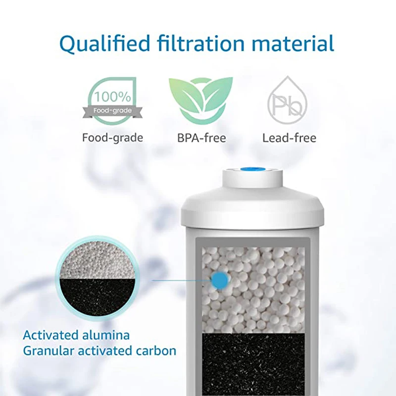 * Высокоэффективная Фильтрация: эффективно уменьшает хлор, фторид, тяжелые металлы, вкус и запах, осадки, крупные частицы и другие вредные вещества. Чистая и здоровая вода может быть использована на открытом воздухе в любое время.
