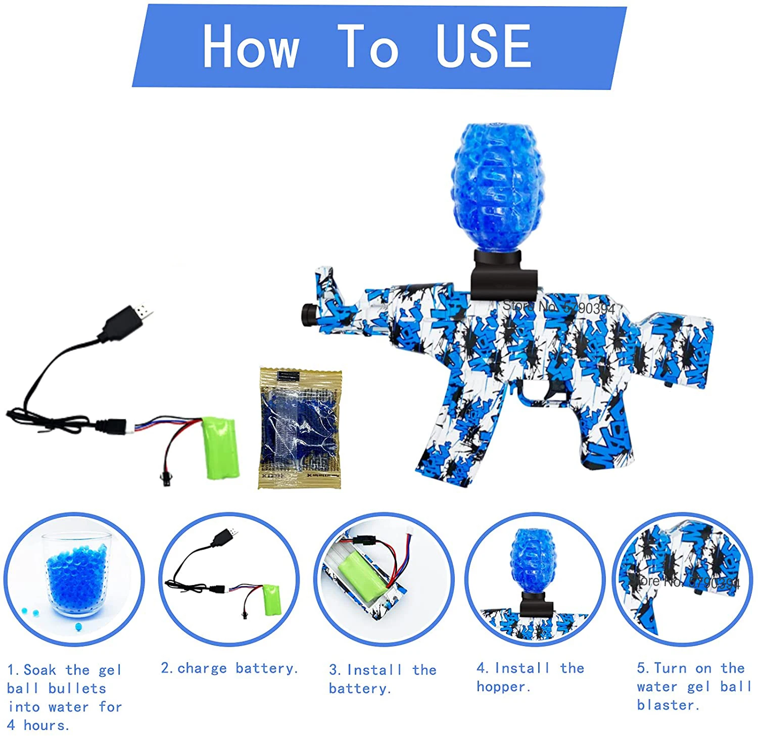 В комплекте]: 1 гелевый шаровой бластер, 1 многоразовый аккумулятор, 1 зарядное устройство USB, 1 бутылка, 10000 бусин для воды, 1 очки.