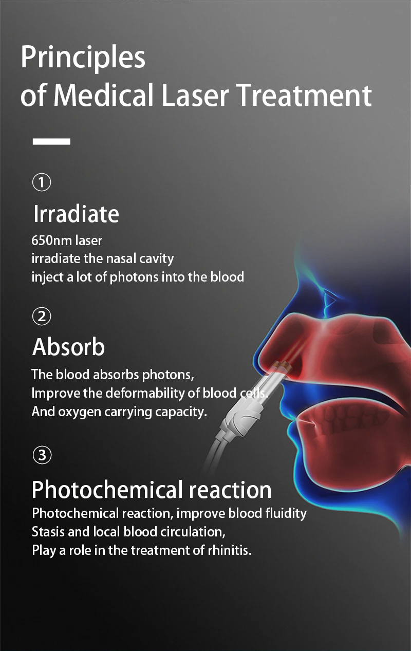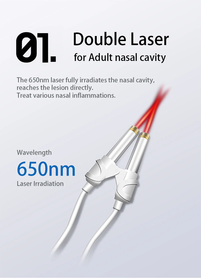 Лазер 650 нм Полностью облучает полость носа и достигает повреждения непосредственно. Для достижения цели лечения различных воспалений полости носа.