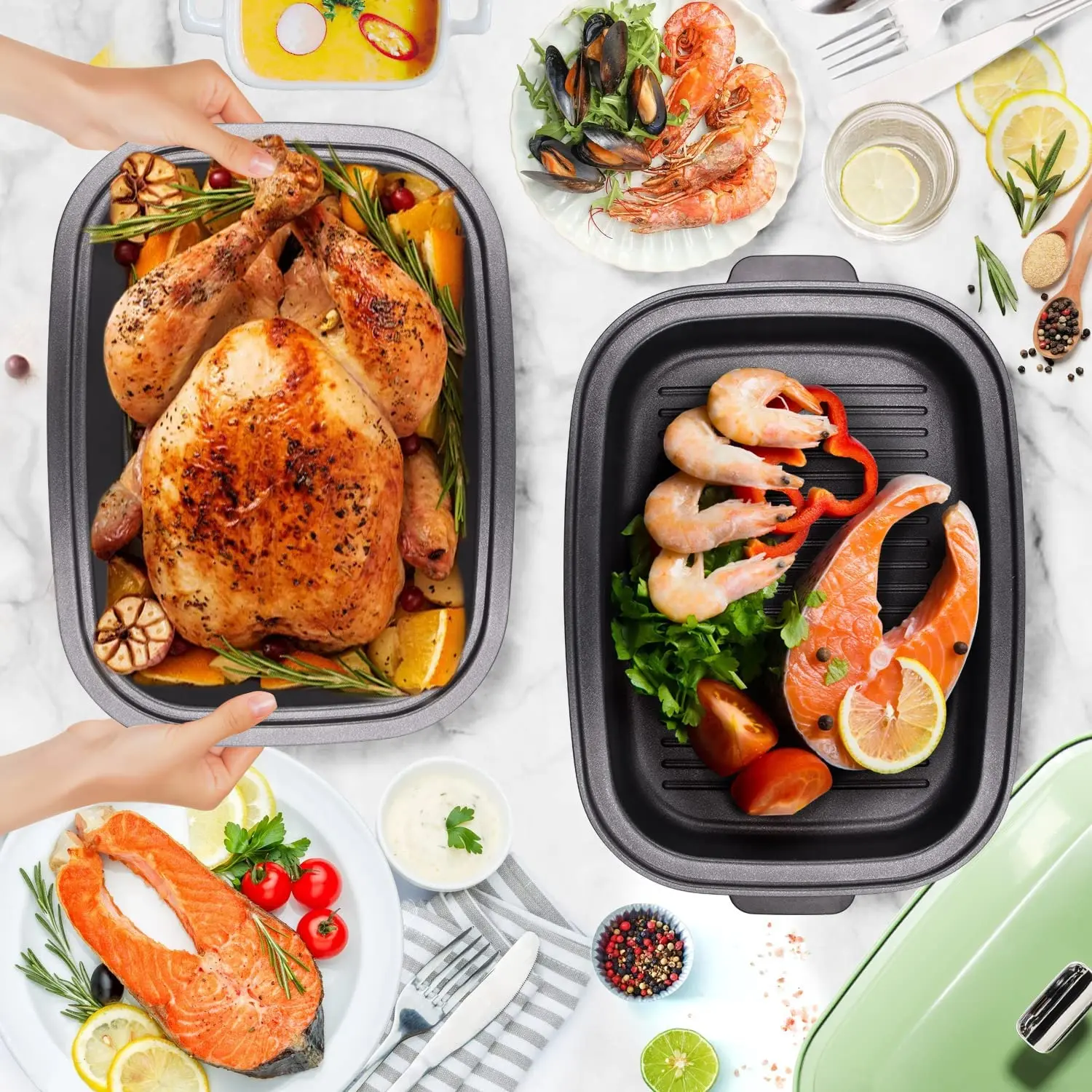 【Широкое применение 】многофункциональный Электрический гриль подходит для жарки, тушения, тушения, обжарки и других методов приготовления пищи. Подходит для бекона, сэндвичей, стейка на гриле, горячего горшка и т. д.