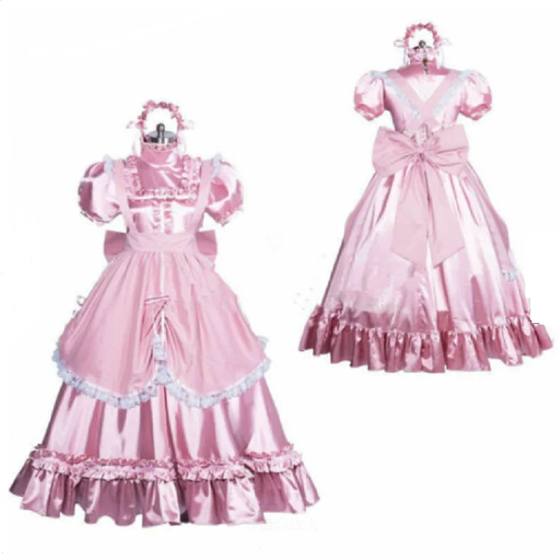 Для милой женской формы. Лиф украшен оборкой и огромным бантом. Пышные рукава отделаны кружевом и бантами. Широкий атласный пояс, который завязывается