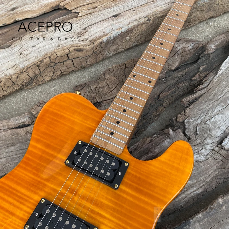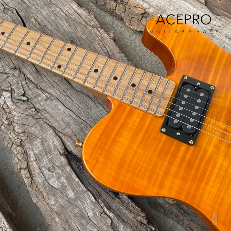 ACEPRO желтая электрогитара, лады из нержавеющей стали, 2 шт. корпус из красного дерева + пламя кленовый верх, жареная Кленовая горловина, золотая фурнитура