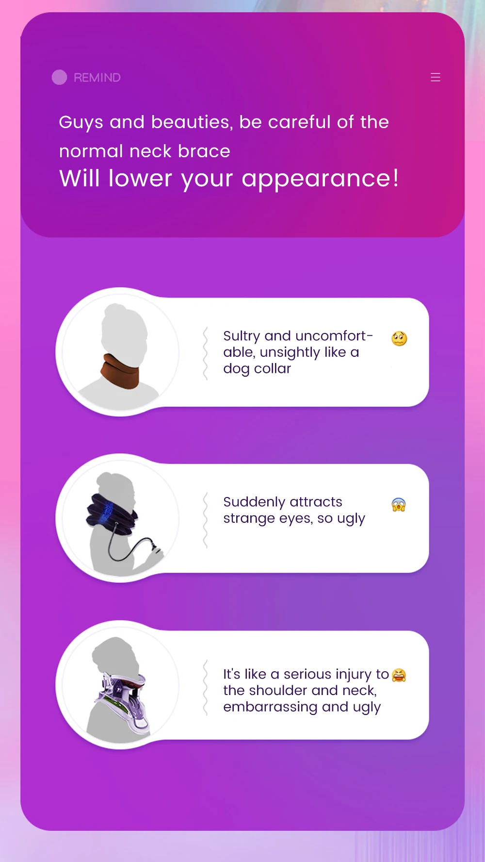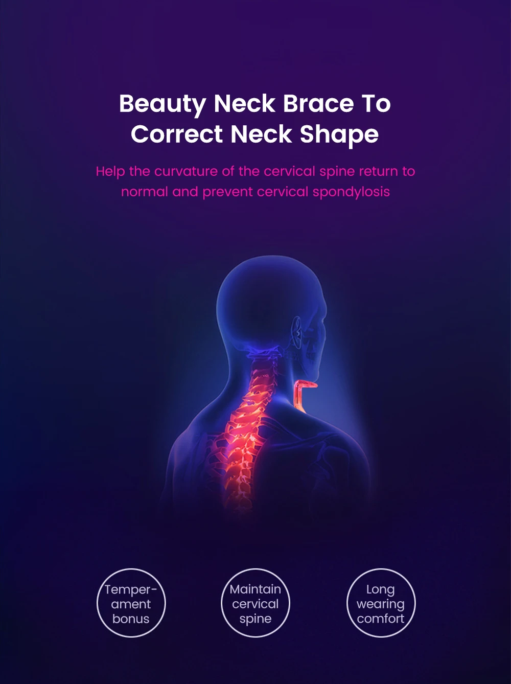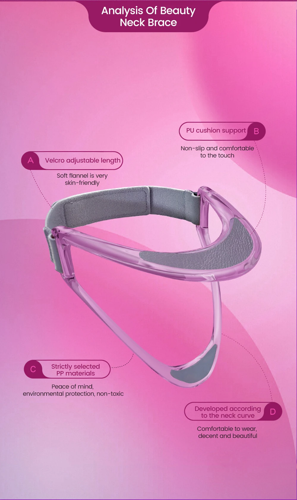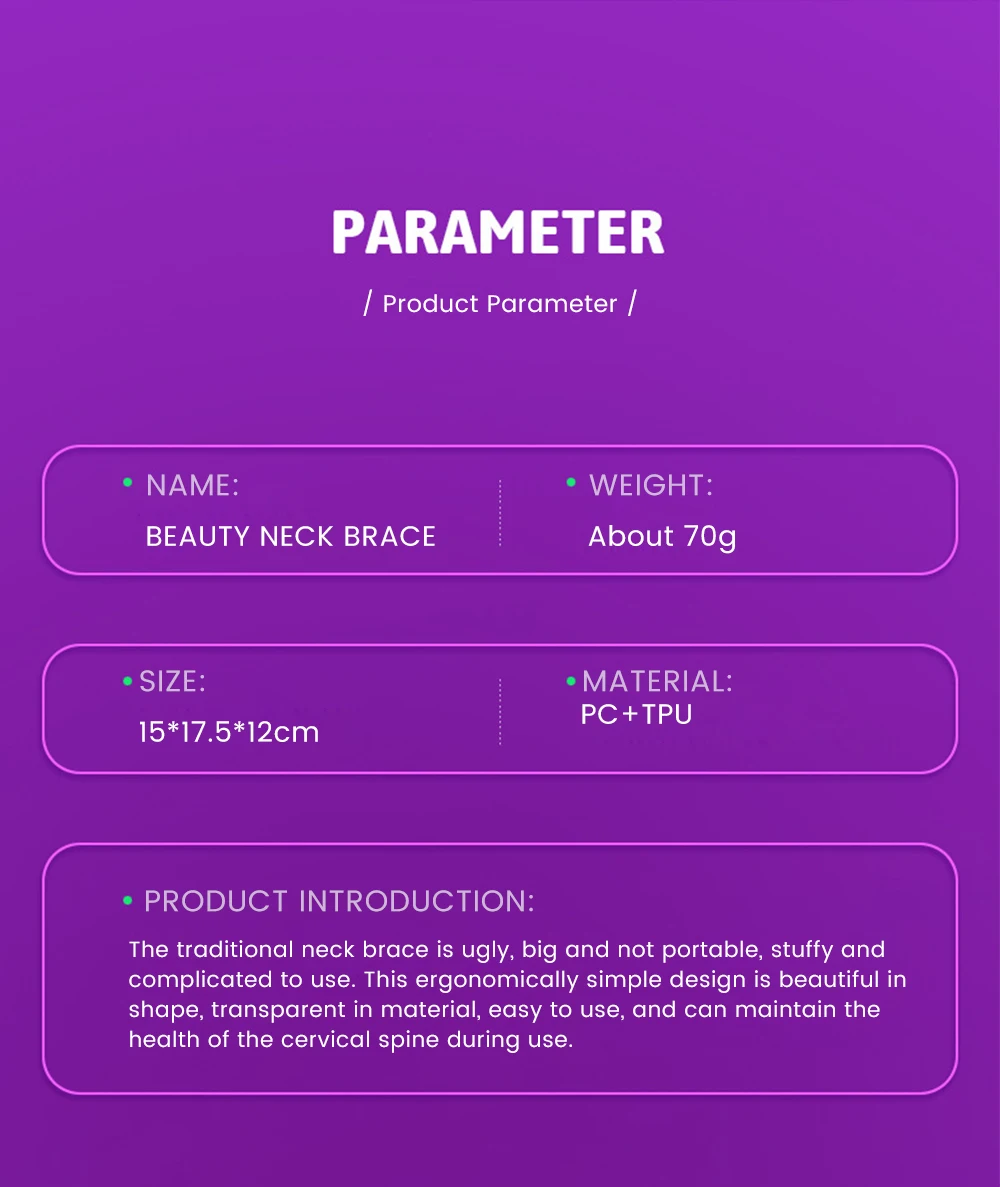 Традиционный бандаж на шею уродливый, большой и не портативный, душный и сложный в использовании. Этот эргономичный простой дизайн красив в форме, прозрачен в материале, прост в использовании и может поддерживать здоровье шейного отдела позвоночника во время использования.