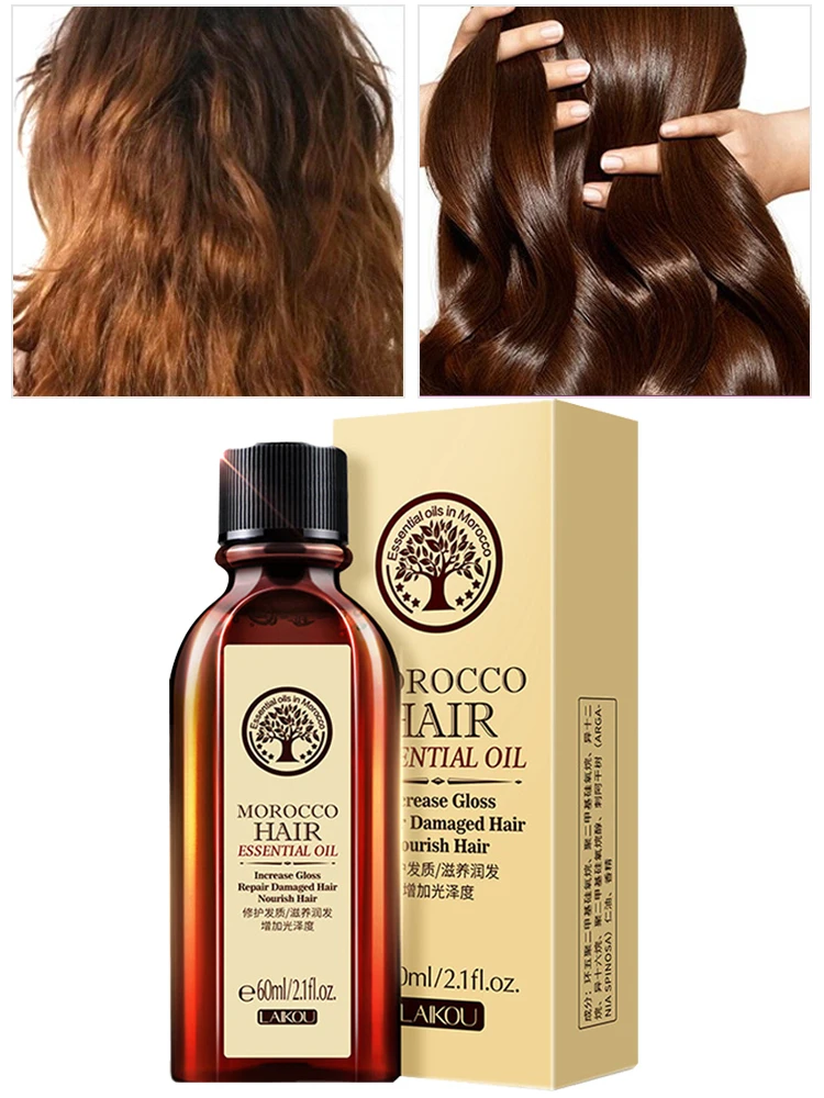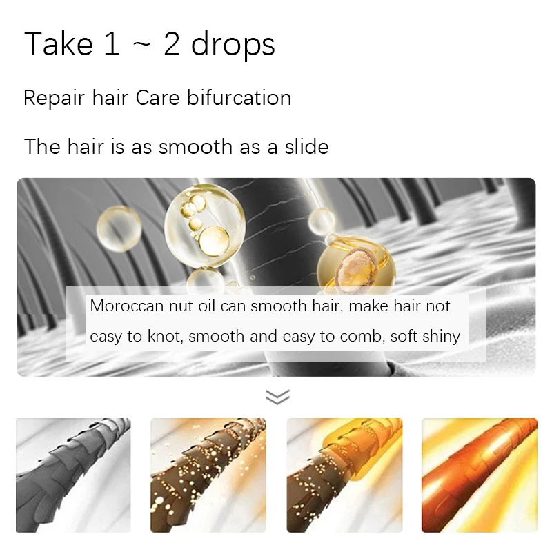Эффективность: Марокканское ореховое масло может сгладить волосы, сделать волосы не легко завязывать, гладкими и легко расчесывать, мягкими и блестящими.