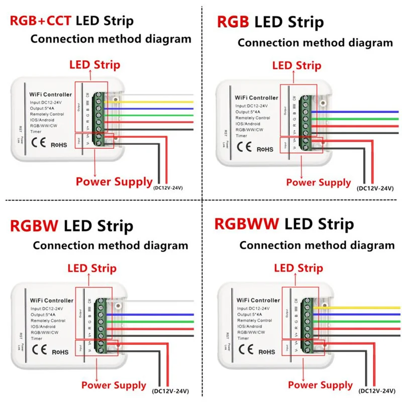 Способ подключения: V + R, G, B, WW и CW Светодиодный светильник, V + V-для источника питания