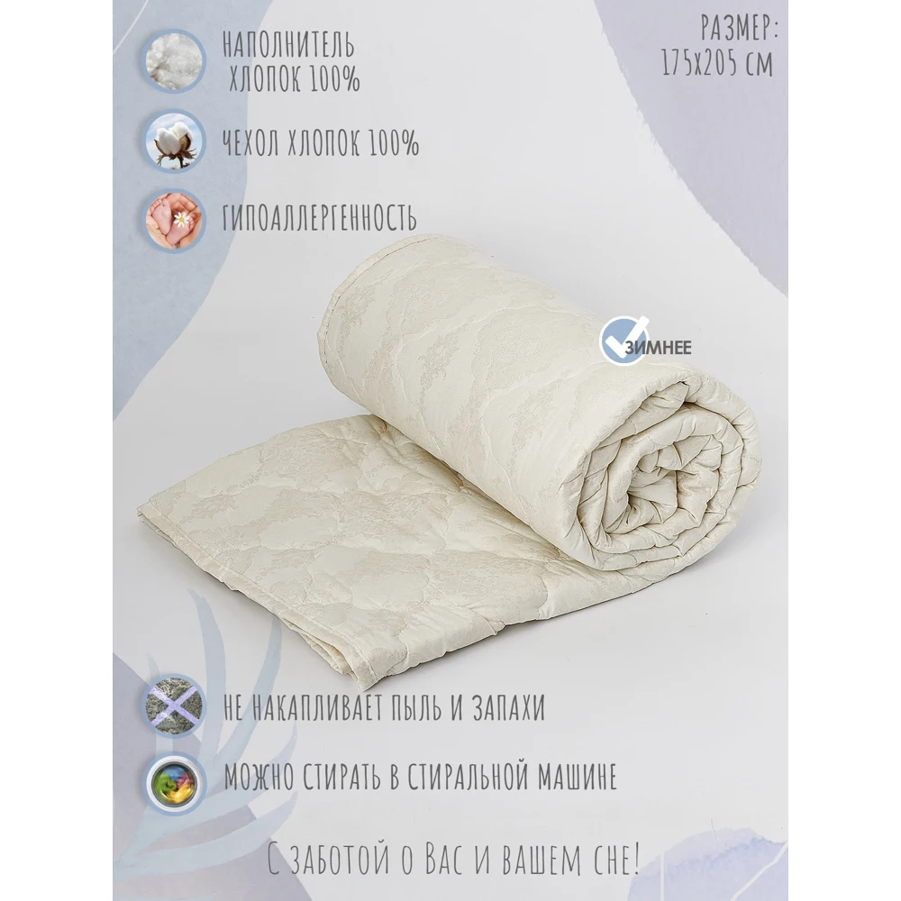 Одеяло с хлопковым наполнителем отличаются экологичностью, они не выделяют токсичных веществ и абсолютно безопасны для здоровья домочадцев. Основным преимуществом считается их гипоаллергенность, которая достигается за счет использования натурального сырья. Хлопок идеален для людей, склонных к аллергическим проявлениям и для детей. Так же к плюсам использования данного наполнителя относится: гигроскопичность, дышащие свойства материала не дают телу мерзнуть или потеть, создавая комфортный микроклимат, практичность и долговечность, антистатичность. Фигурная стежка у нашего изделия, способствует равномерному распределению наполнителя. Цвет и рисунок изделия может незначительно отличаться от представленного на фото.