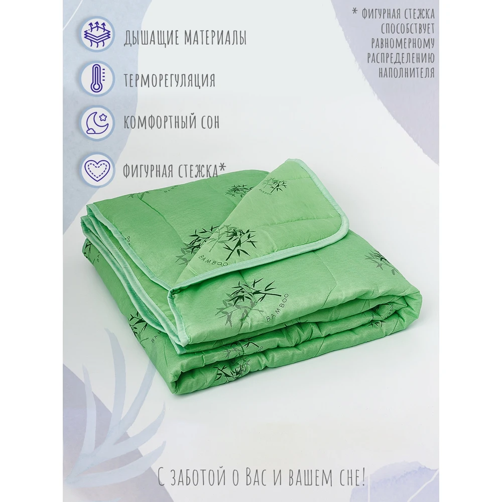 Наше одеяло из бамбукового волокна очень легкое и экологичное. Под ним приятно спать летом и зимой. Среди достоинств этого наполнителя можно назвать: свободная циркуляция воздуха, антибактериальные свойства бамбукового волокна не снижаются даже после нескольких десятков стирок, научно доказано, что более 70% бактерий гибнет на поверхности этого материала, изготавливается из натурального и экологически чистого сырья, подходит для людей с повышенной чувствительностью и склонностью к аллергическим реакциям, имеет небольшой вес и создает комфортную температуру, благодаря чему значительно улучшается качество сна, практичность и надежность, гигроскопичность. Использование нами натуральных материалов делает изделие абсолютно безопасным для здоровья людей любого возраста. Фигурная стежка у нашего изделия, способствует равномерному распределению наполнителя. Цвет и рисунок изделия может незначительно отличаться от представленного на фото.