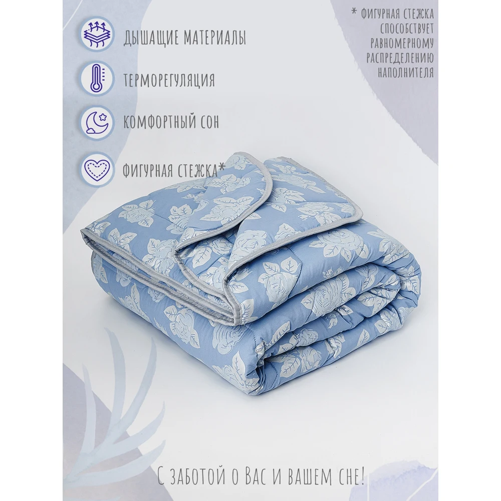 Одеяло с наполнителем лебяжий пух, обладает целым набором привлекательных свойств. Оно хорошо сохраняет тепло и отличается повышенной износостойкостью. Преимущества данного наполнителя: гипоаллергенный, исключает аллергию на пыль, подходит детям и аллергикам, людям с чувствительной проблемной кожей, исключает размножение живых организмов (пылевой клещ, грибки, плесень), не имеет запаха, не впитывает посторонние агрессивные ароматы, устойчив к быстрому износу, пух не скатывается, не сбивается в ком, сохраняет терморегуляцию, легкий, пушистый, упругий материал, держит форму изделия в течении всего срока использования, не требует специального ухода, подлежит стирке в стиральной машине при щадящем режиме, быстро сохнет. Фигурная стежка у нашего изделия, способствует равномерному распределению наполнителя. Цвет и рисунок изделия может незначительно отличаться от представленного на фото.