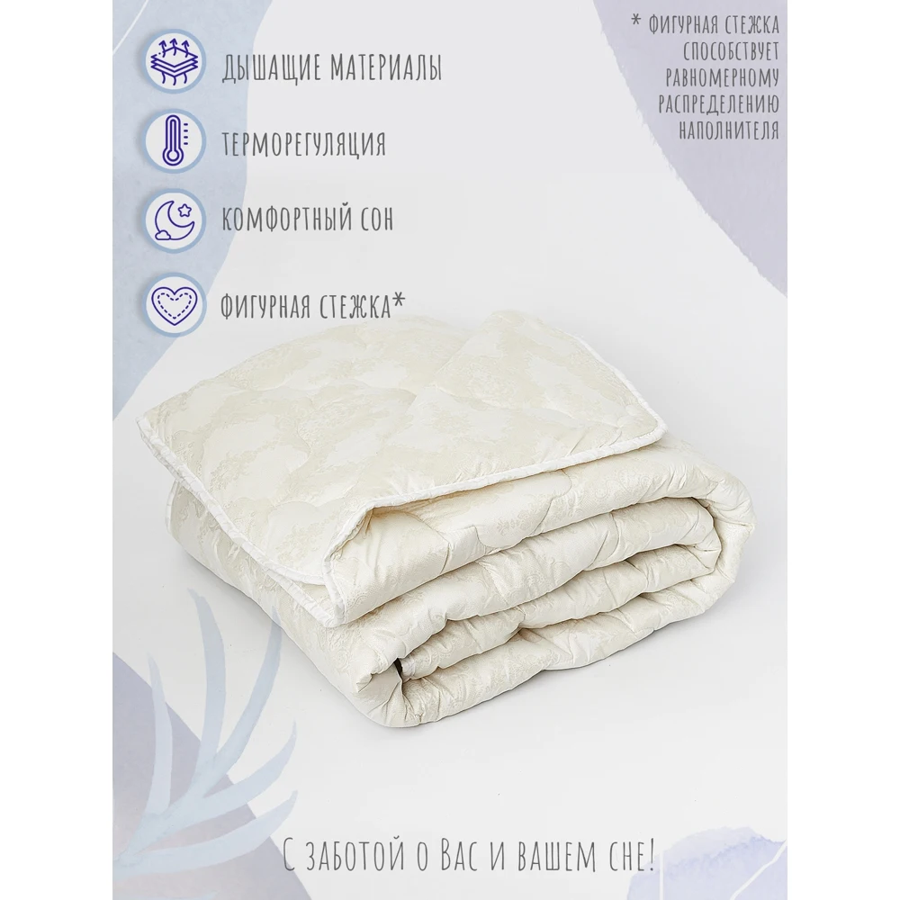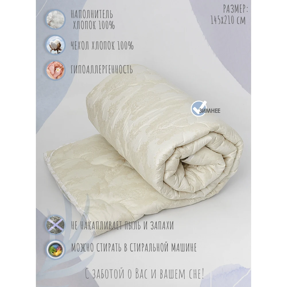 Одеяло с хлопковым наполнителем отличаются экологичностью, они не выделяют токсичных веществ и абсолютно безопасны для здоровья домочадцев. Основным преимуществом считается их гипоаллергенность, которая достигается за счет использования натурального сырья. Хлопок идеален для людей, склонных к аллергическим проявлениям и для детей. Так же к плюсам использования данного наполнителя относится: гигроскопичность, дышащие свойства материала не дают телу мерзнуть или потеть, создавая комфортный микроклимат, практичность и долговечность, антистатичность. Фигурная стежка у нашего изделия, способствует равномерному распределению наполнителя. Цвет и рисунок изделия может незначительно отличаться от представленного на фото.
