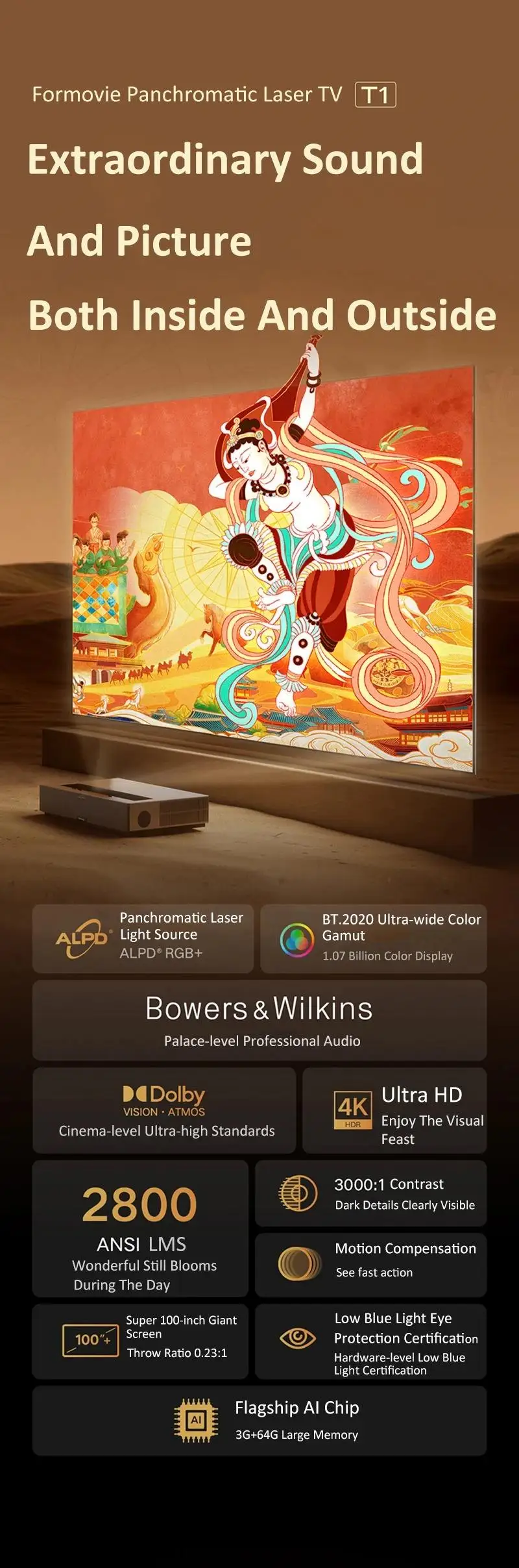 -Полноцветный лазерный светильник, Сверхширокая цветовая гамма BT.2020, с использованием технологии отображения кинотеатрального лазерного проекционного зала, по сравнению с обычным полноцветным лазером, яркость, цвет и контрастность полностью обновлены. Включает в себя 1,07 млрд цветов, восстанавливая наиболее реалистичный цвет изображения