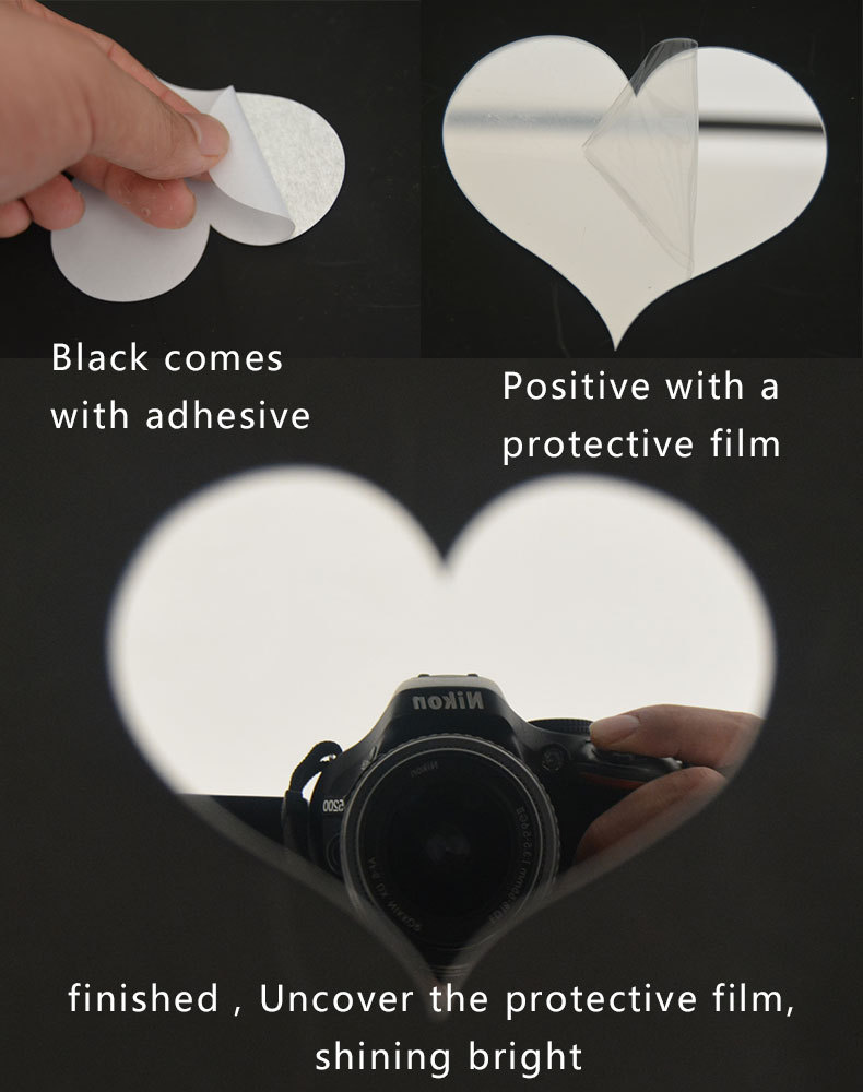 Как использовать: каждая пластиковая Зеркальная Наклейка крепится с защитной пленкой на лицевой стороне, оторвав защитную пленку, может показать отражение зеркала; отшелушивающая задняя сторона приклеивается к поверхности объекта; Обратите внимание, чтобы выбрать поверхность как можно более smmoth, чтобы показать хороший спектральный эффект отражения