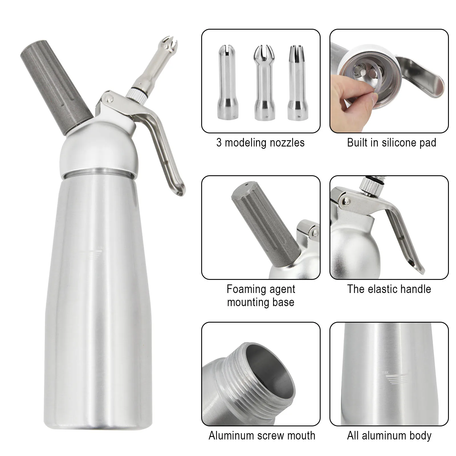 1. Профессиональный диспенсер для крема: Изготовлен из высококачественного алюминия, прочный и прочный, эргономичный корпус и удобная ручка, красивый внешний вид, серебристый дизайн и современная и классическая кухонная утварь интегрированы.