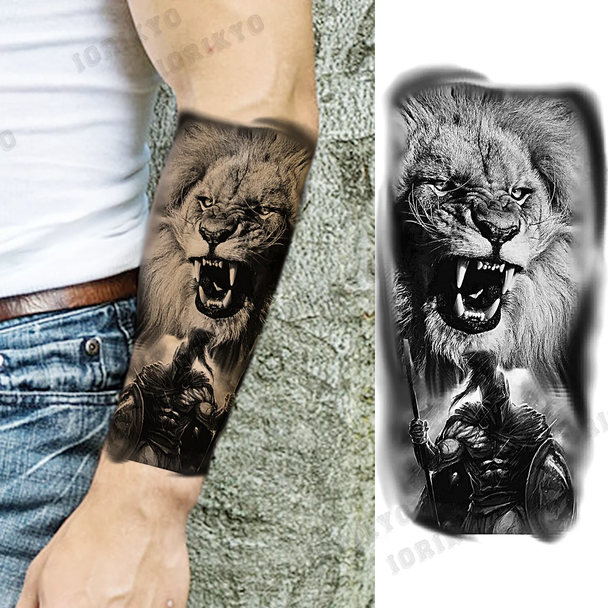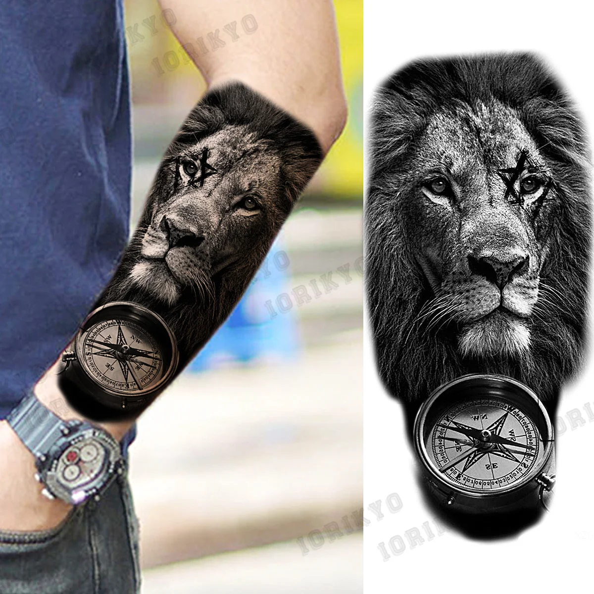Реалистичные Временные татуировки воина льва для мужчин, взрослые компасы, цветок волка, поддельные татуировки, переводная вода, половинный рукав, тату, наклейка