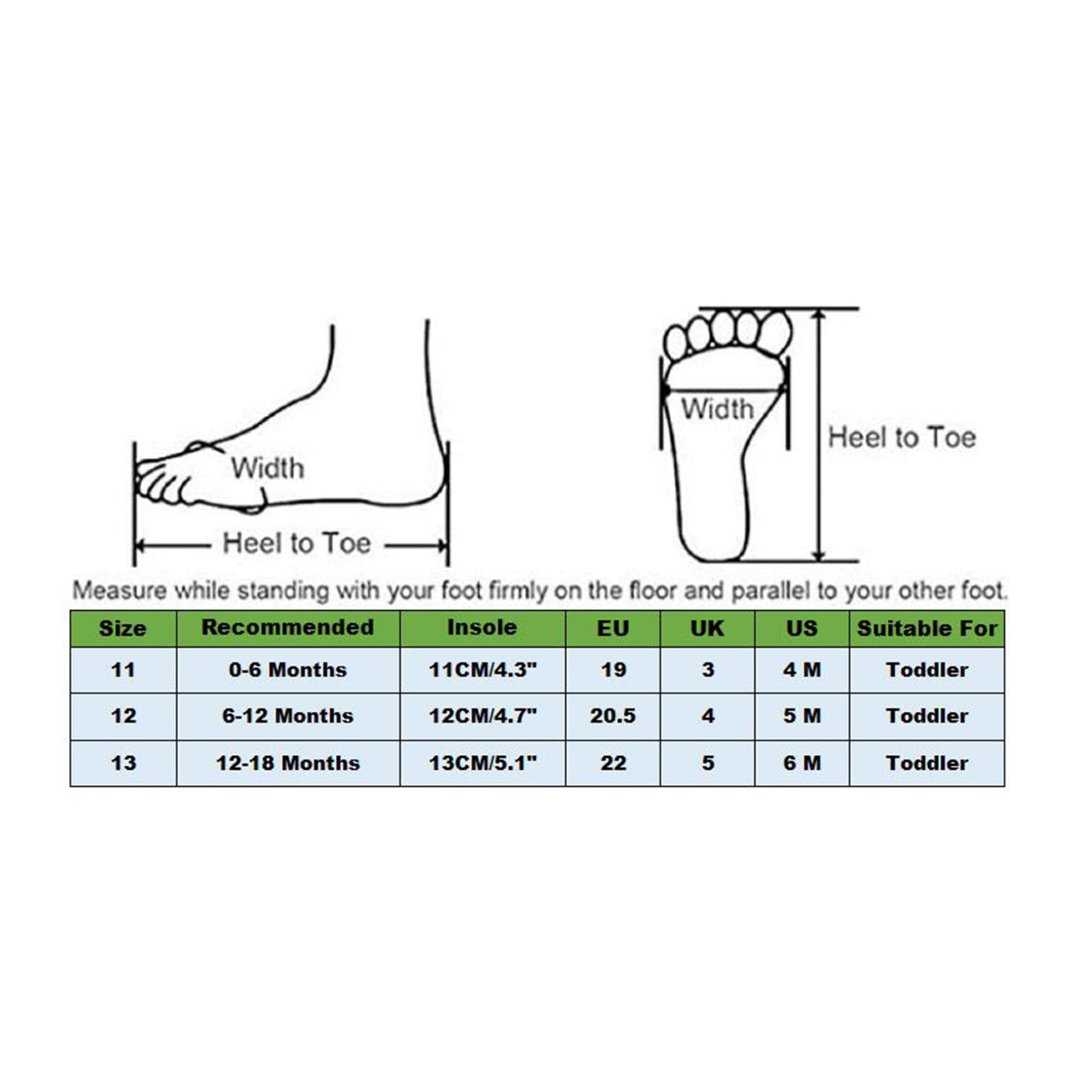 Размеры Рекомендуемый возраст Длина стельки ЕС Великобритания США Подходит для 11 0-6 месяцев 11 см/4,3" 19 3 4 м Для малышей 12 6-12 месяцев 12 см/4,7" 20,5 4 5 м Для малышей 13 12-18 месяцев 13 см/5,1" 22 5 6 м Для малышей