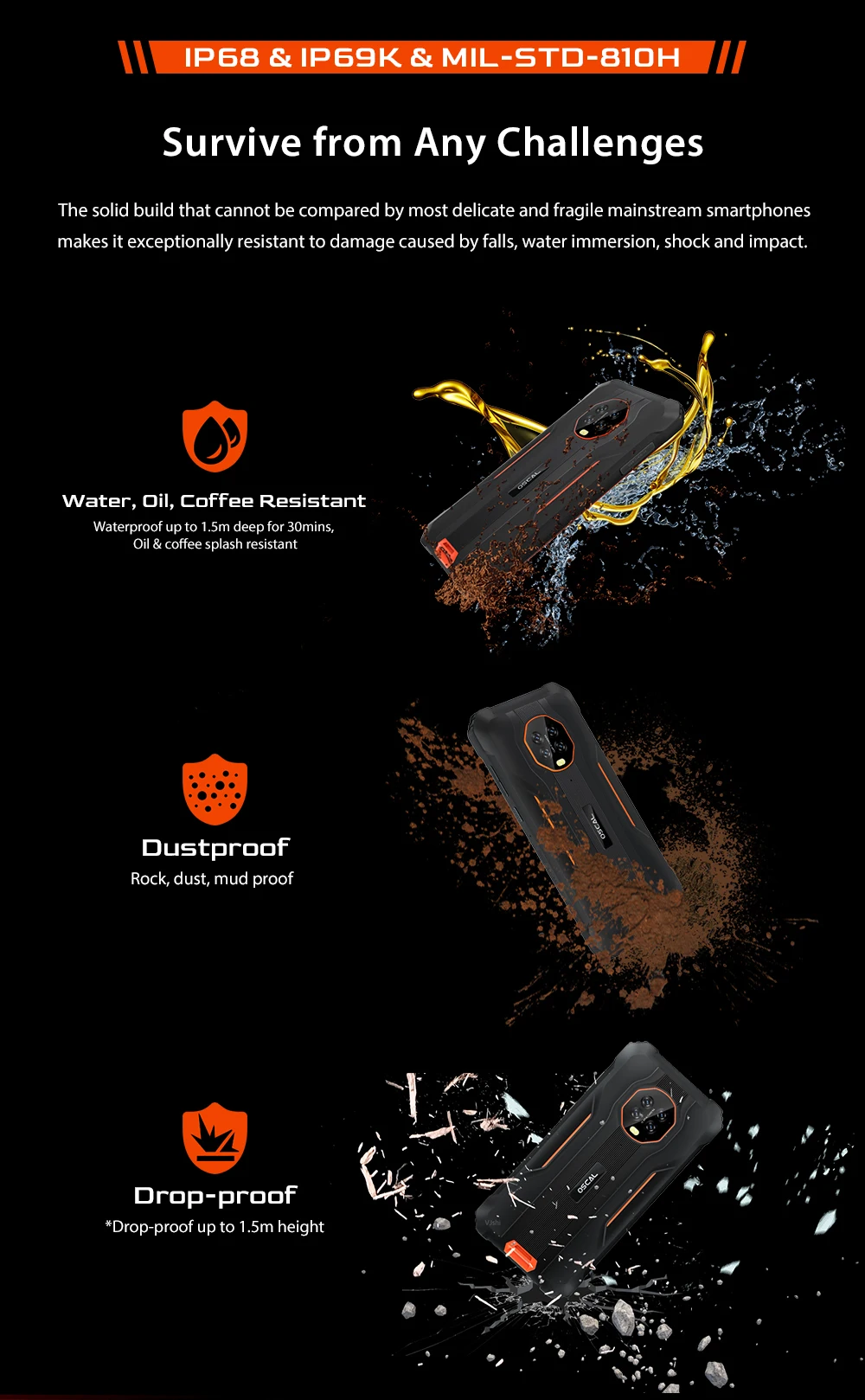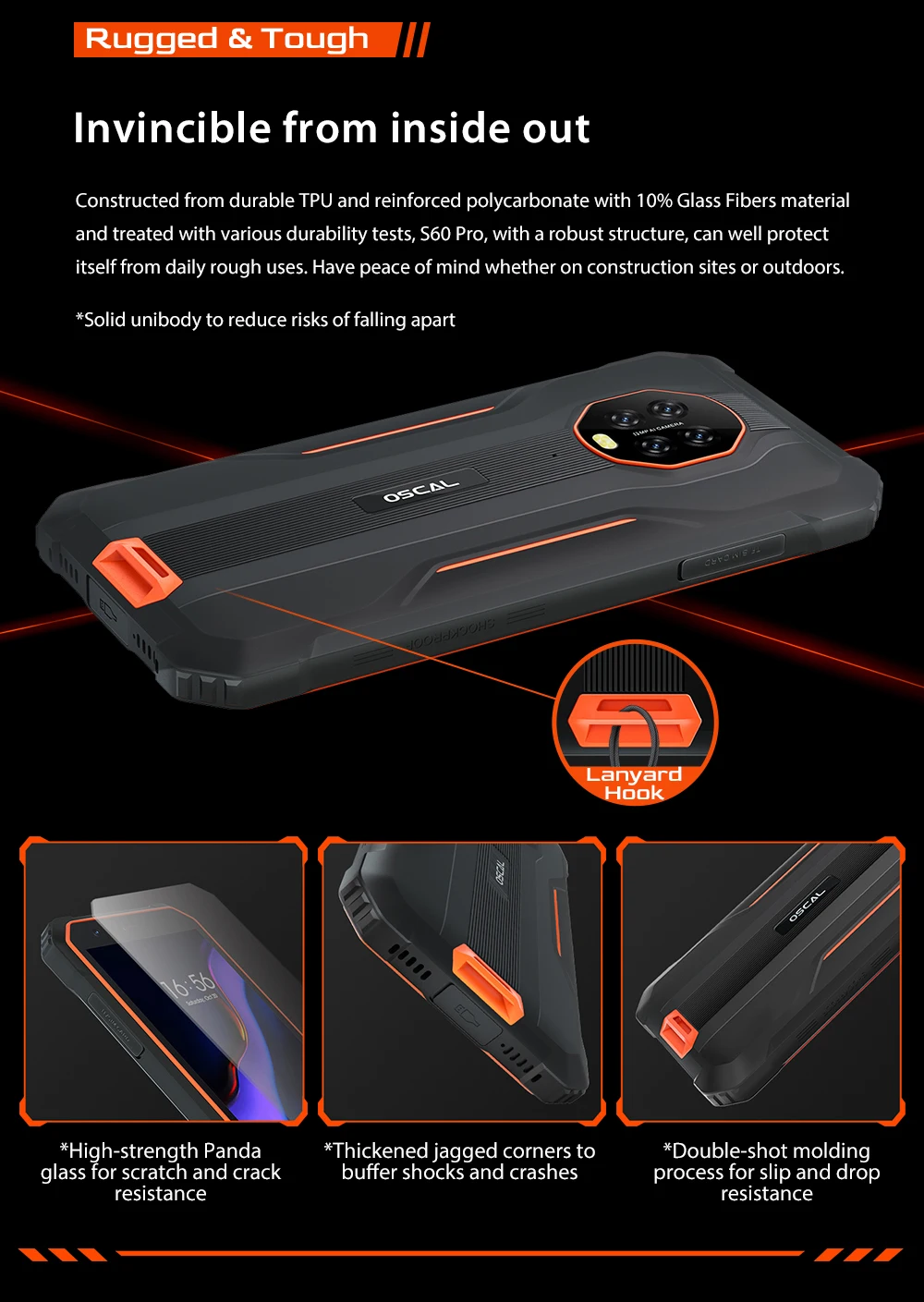 Изготовлен из прочного ТПУ и армированного поликарбоната с 10% материалом из стекловолокна и обработан различными испытаниями способности dur, S60 Pro, с прочной структурой, может хорошо защитить его от ежедневного грубого использования. Имейте спокойствие, будь то на строительных площадках или на открытом воздухе.