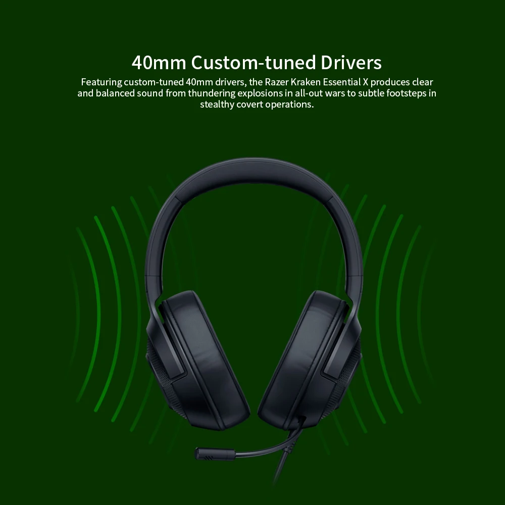 Благодаря настраиваемым 40 мм драйверам Razer Kraken Essential X производит четкий и сбалансированный звук от разгрома взрывов во всесезонных войнах до тонких шагов в тайных операций.
